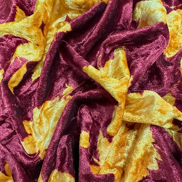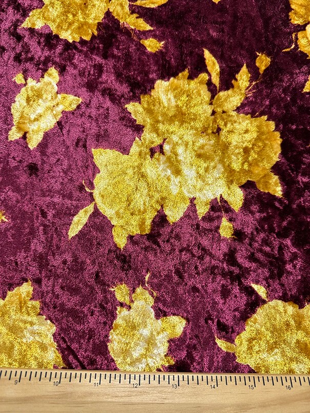 Burgundy and Gold Floral Print Stretch Panne Velour Fabric By the Yard