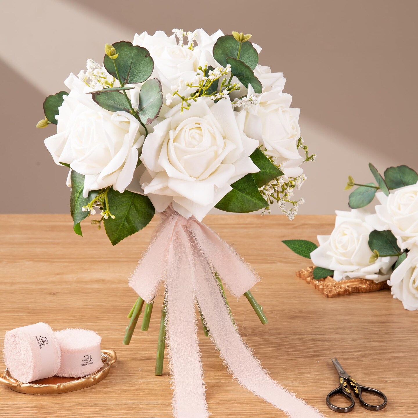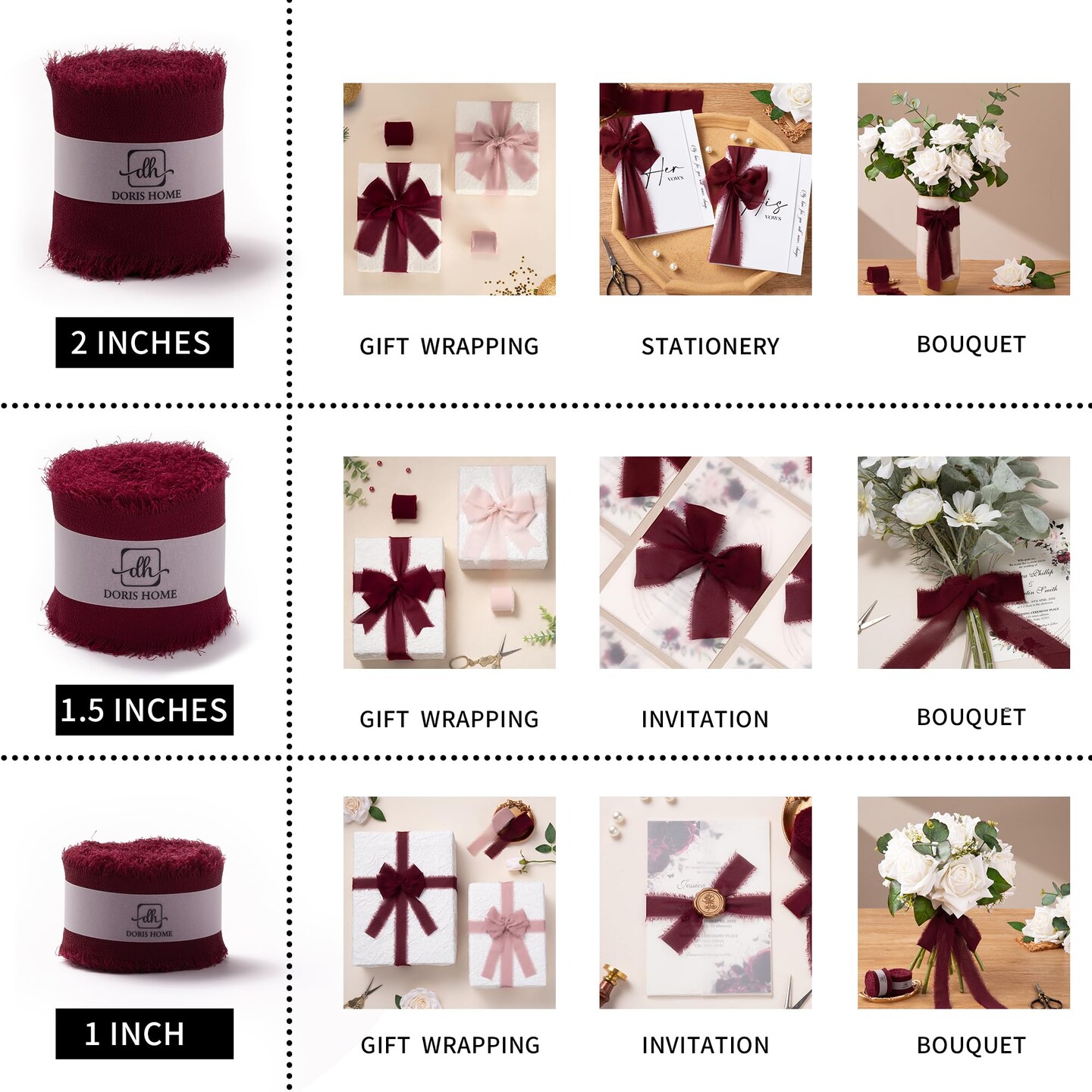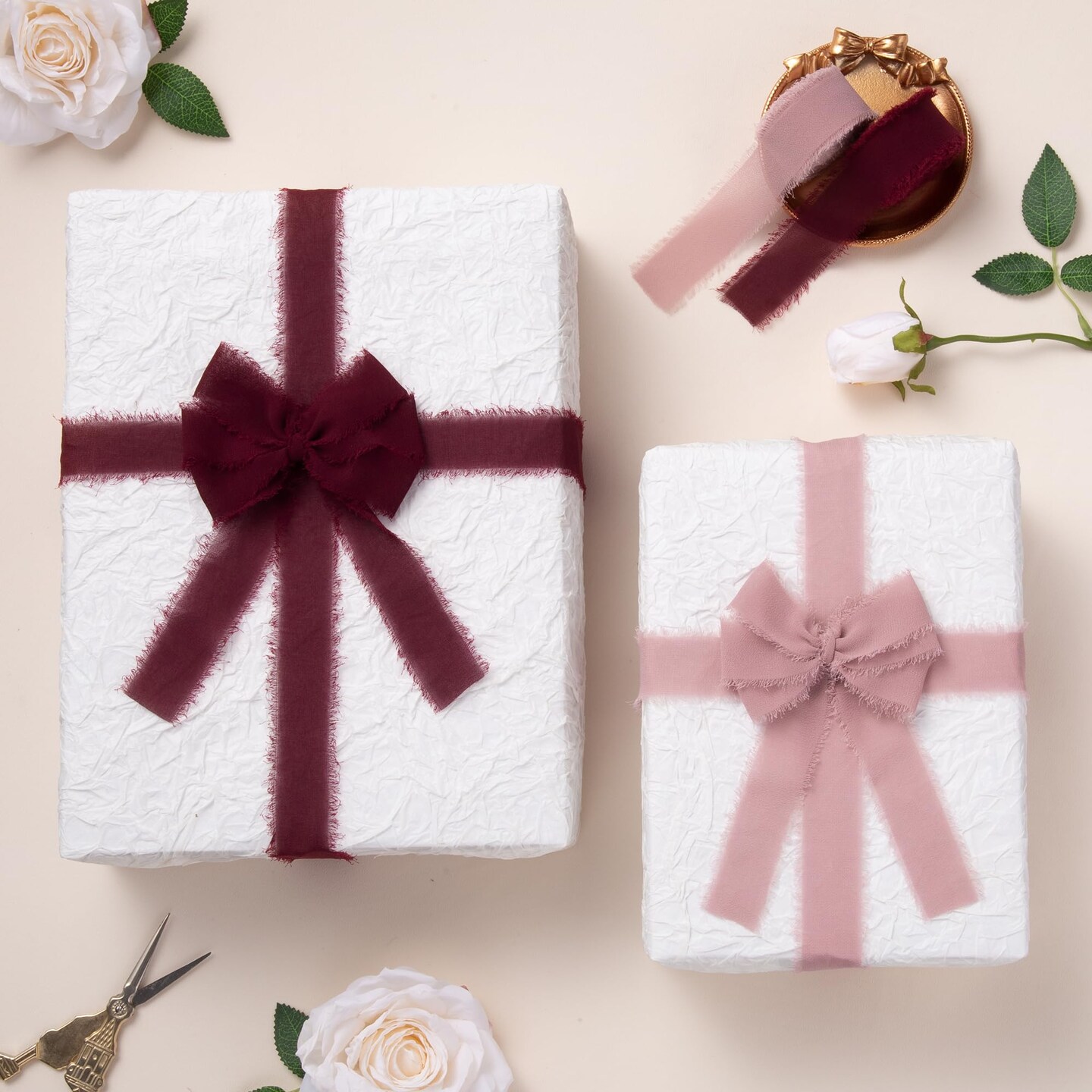 Burgundy and Pink Chiffon Ribbon for Flower Bouquet, 1" x21Yd Fabric Ribbon for Gift Wrapping, Handmade Frayed Ribbon for Wedding Invitations/Christmas Decorations