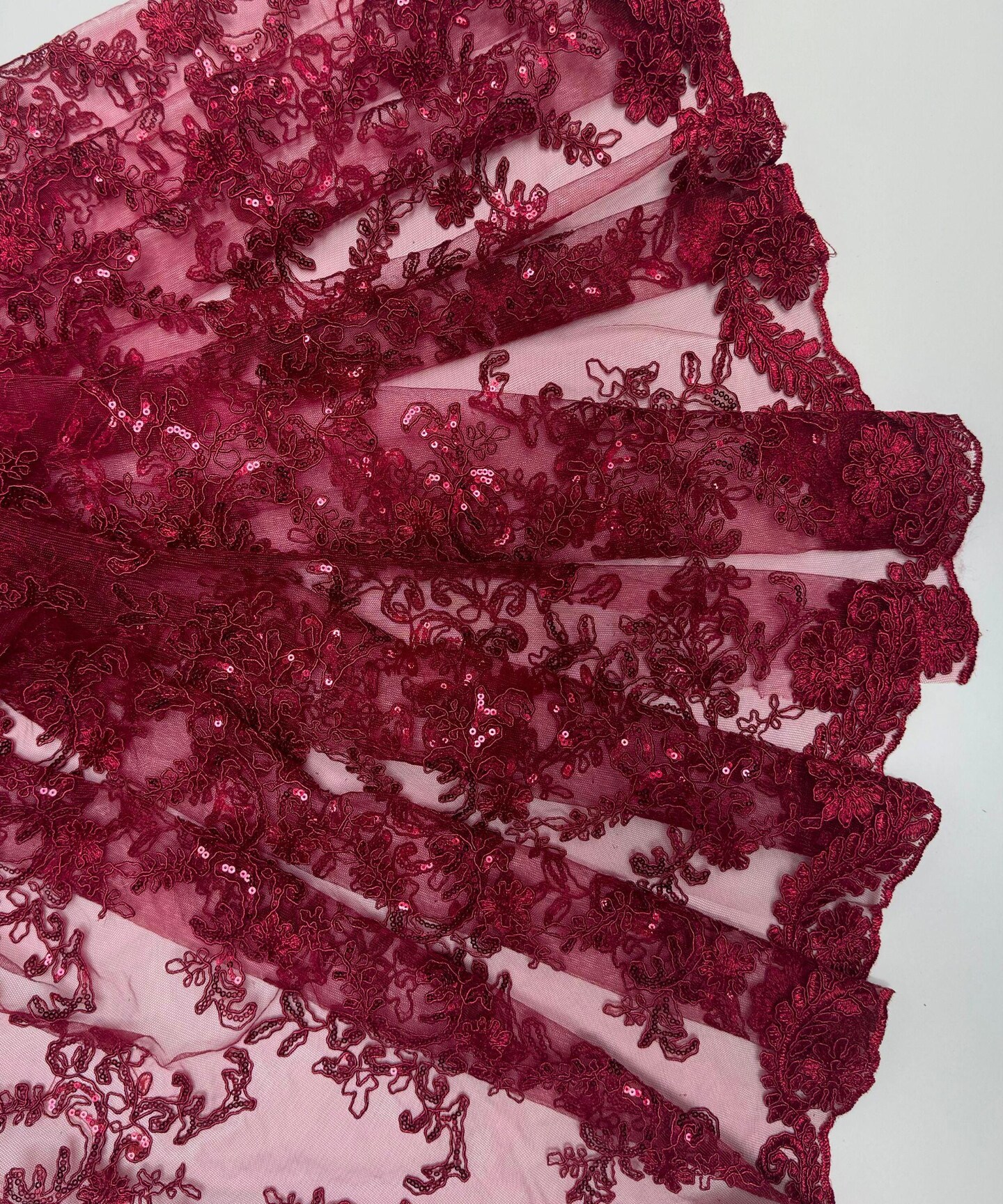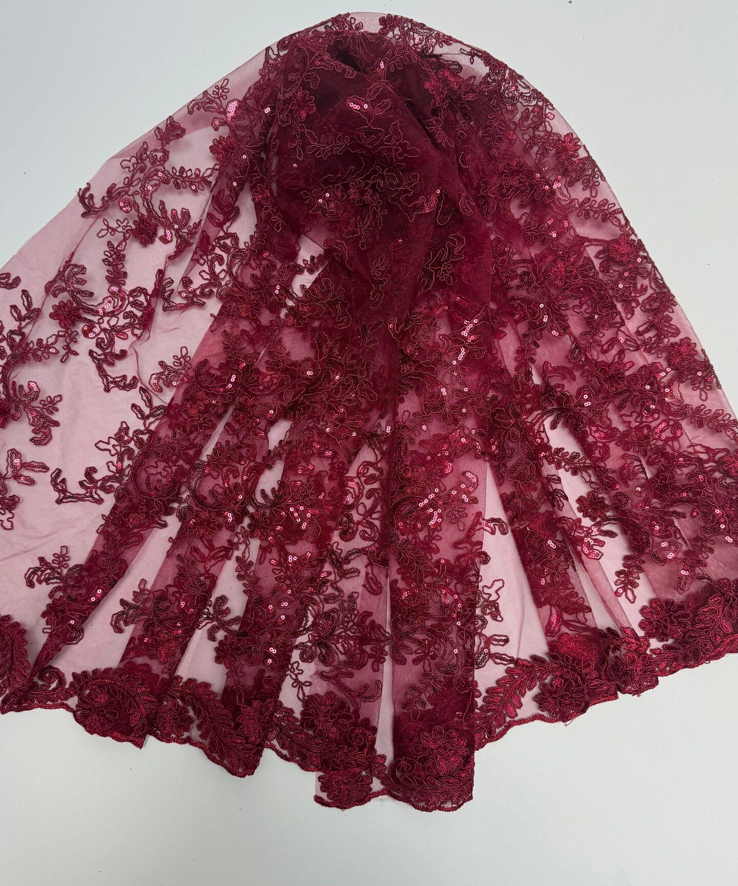 Burgundy Sequin Embroidered Lace Fabric by the Yard, 54" Wide Floral Mesh Lace with Double Scalloped Edges