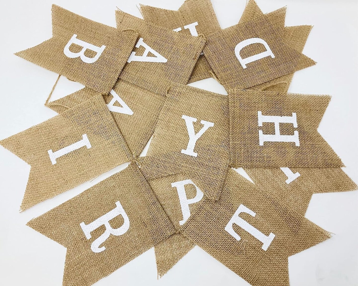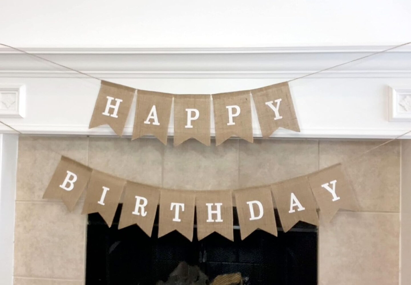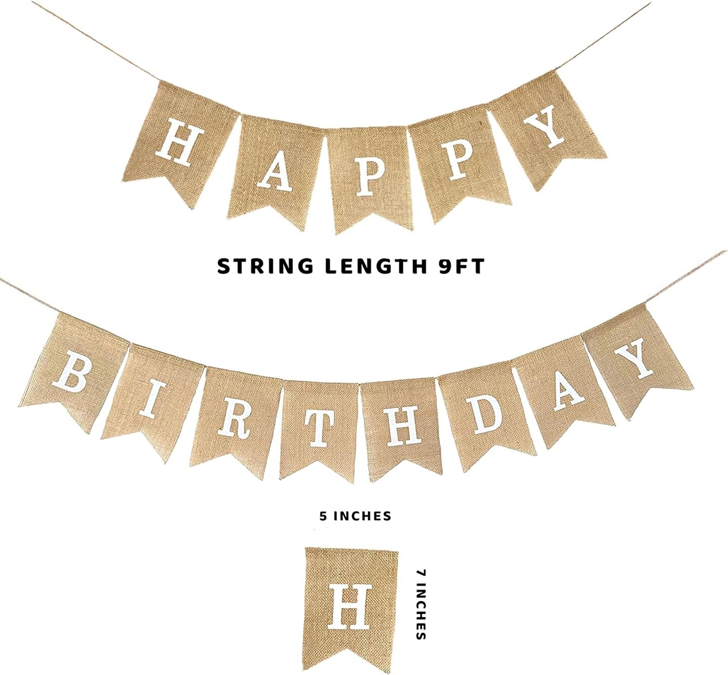Burlap Happy Birthday Banner for Birthday Party Decorations (White Print)