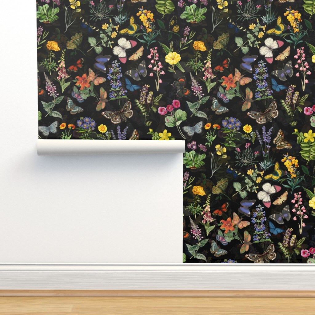 Butterfly House Moody Floral Moths On Black Spring Flower English Cottage Shabby Chic Flowers Core Custom Removable Wallpaper by Spoonflower Peel & Stick Wallpaper 2FT Wide