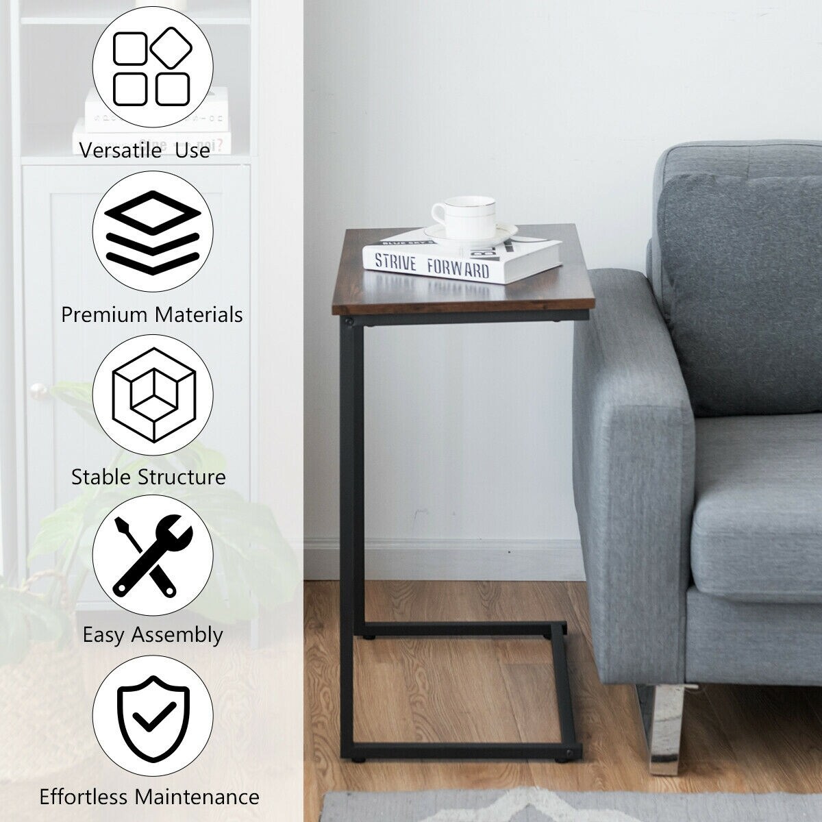 C Shaped Side Table Sofa End Table with Metal Frame for Living Room Rustic Brown
