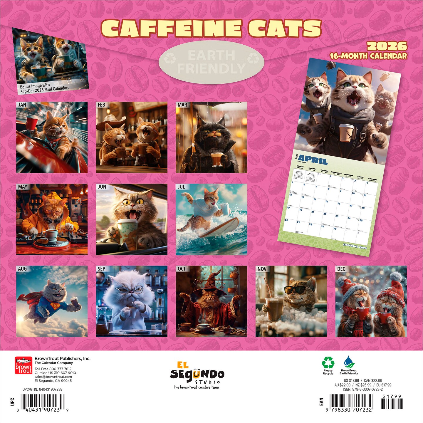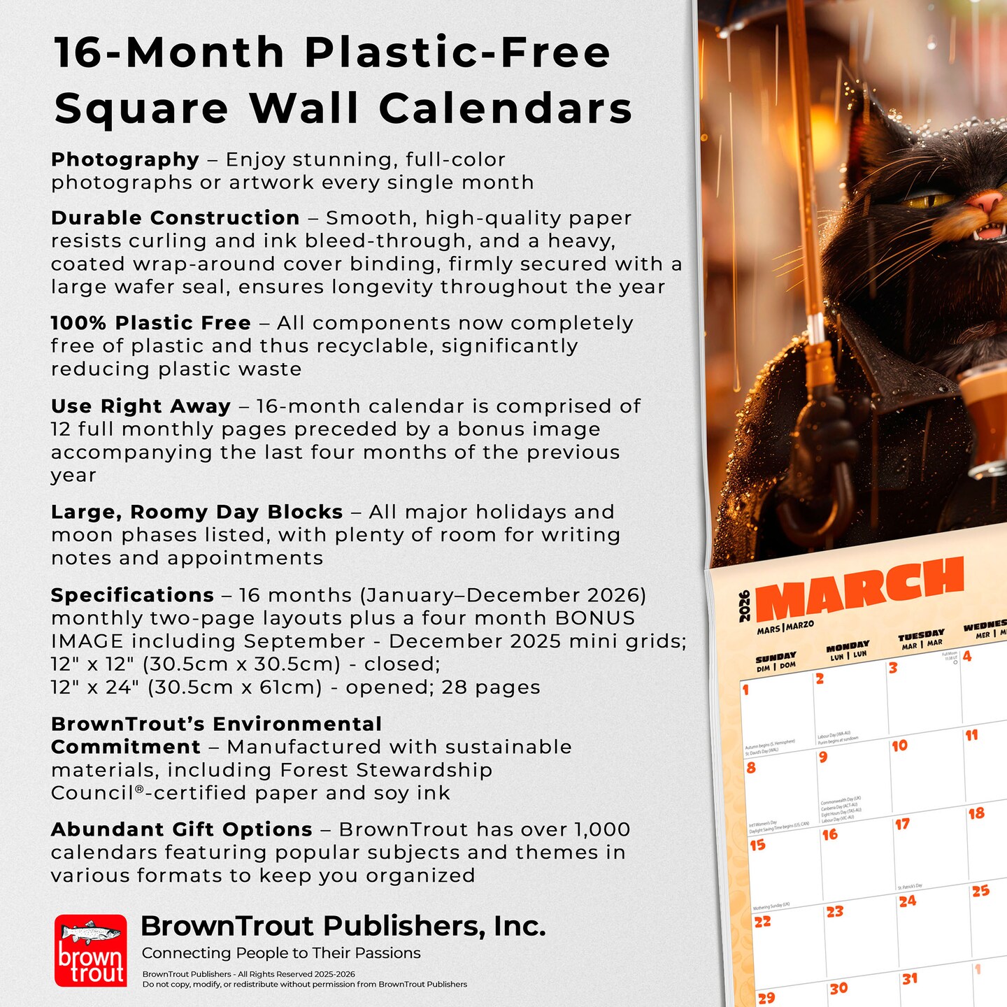 Caffeine Cats | 2026 12 x 24 Inch (Hanging) Monthly Square Wall Calendar | Plastic-Free | BrownTrout | Pets Funny Animals Feline