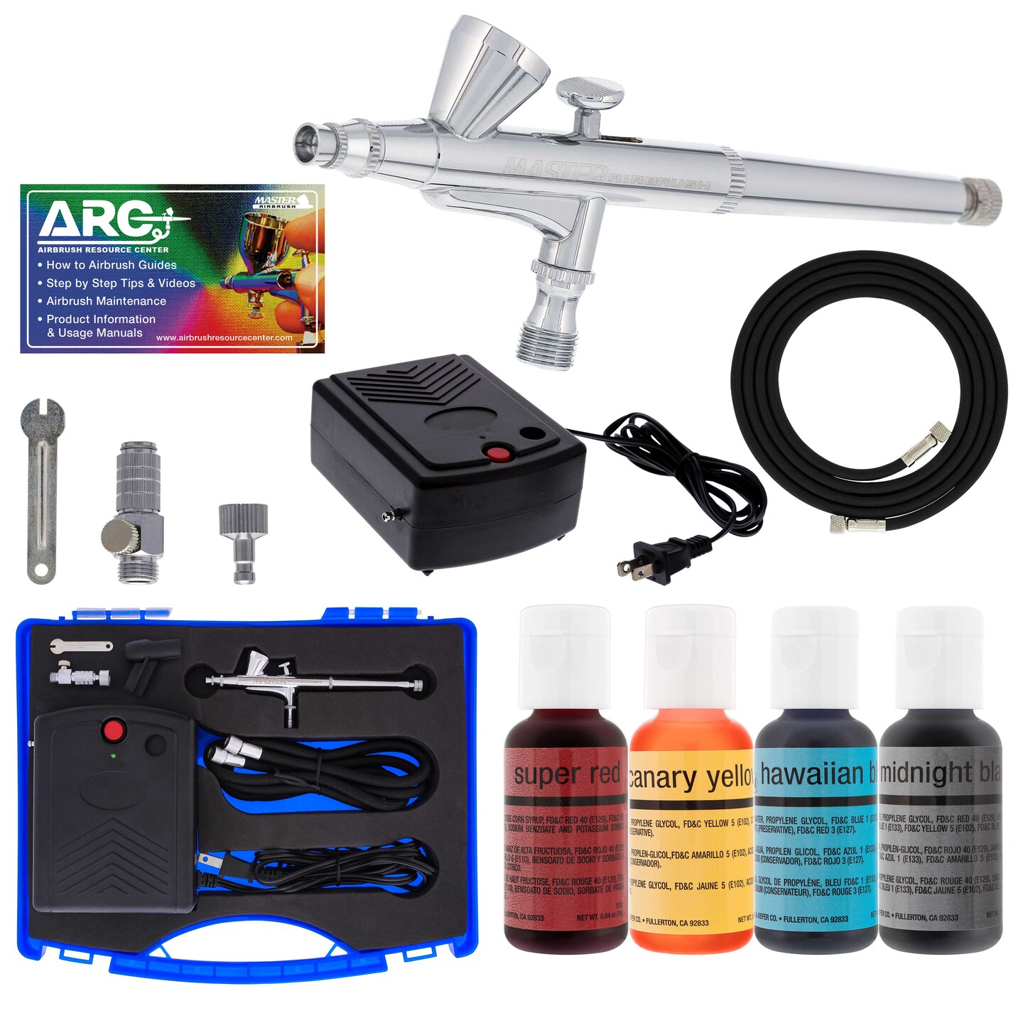 Cake Decorating Airbrushing System Kit with 4 Chefmaster Food Colors, Gravity Feed Dual-Action Airbrush, Air Compressor, Hose, How-To-Airbrush Guide