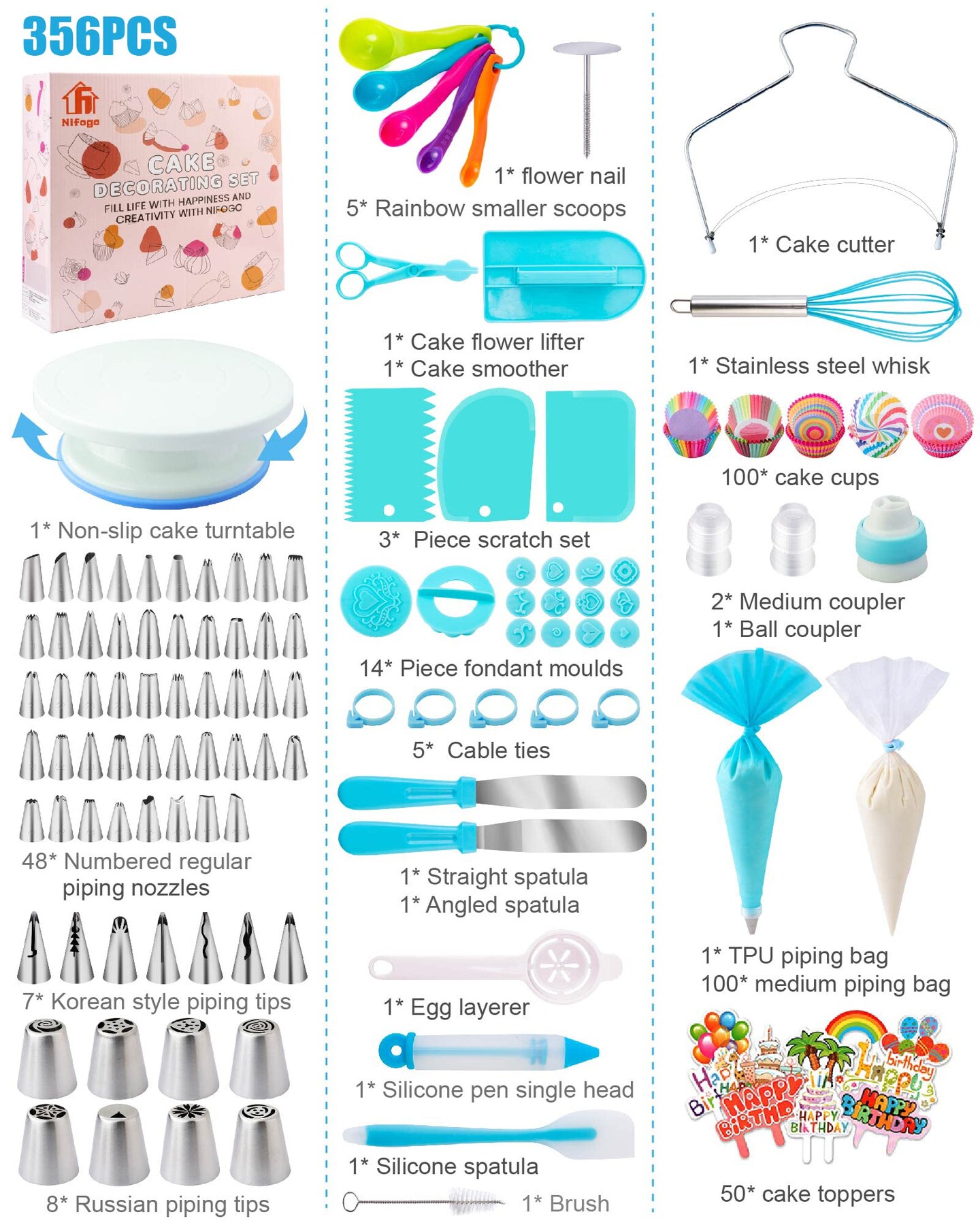 Cake Decorating Supplies Kit Tools 356pcs, Nifogo Baking Accessories with Cake Turntable, Pastry Piping Bag, Piping Icing Tips for Beginners
