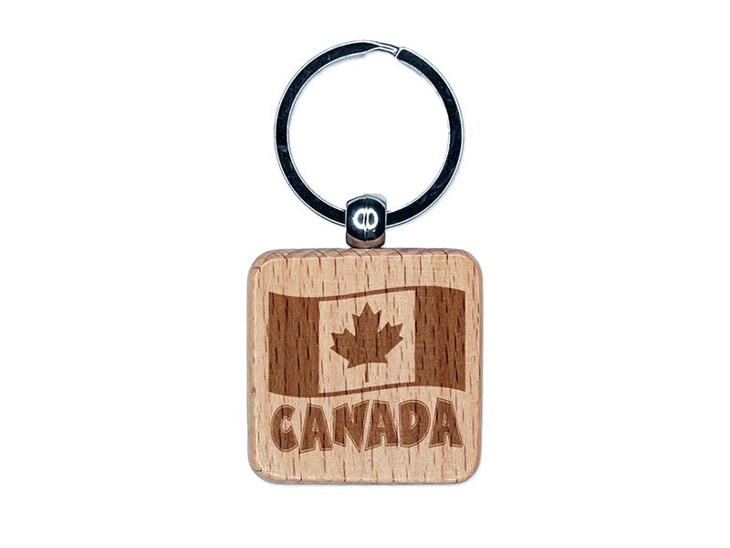 Canada with Waving Flag Cute Engraved Wood Square Keychain Tag Charm
