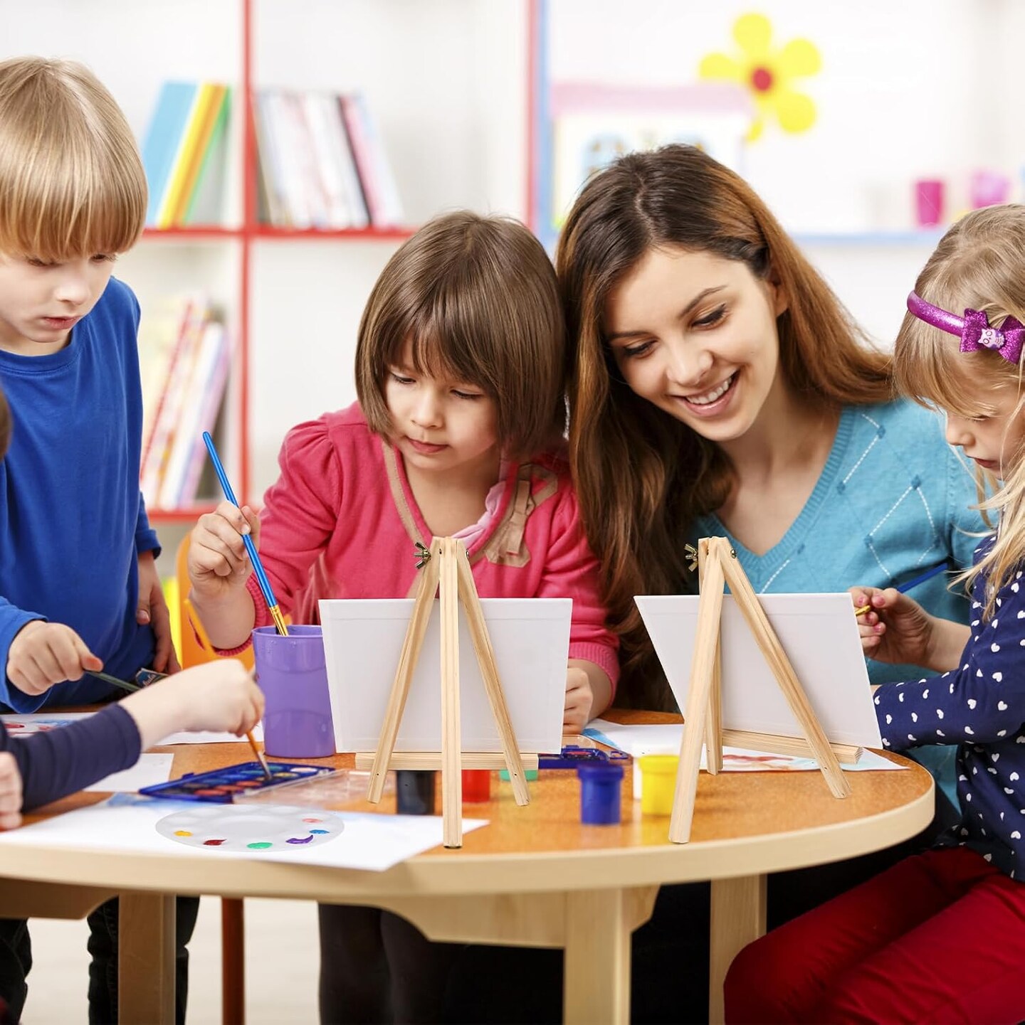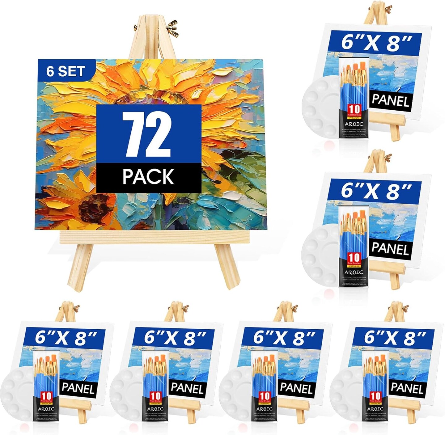 Canvas and Easel Set,Art Painting Set with 78 Pack (6 PCS 9" Wood Easels, 60 Brushes, 6 Canvas Boards and 6 Palette) Painting Supplies kit for Kids & Adults to Painting Party