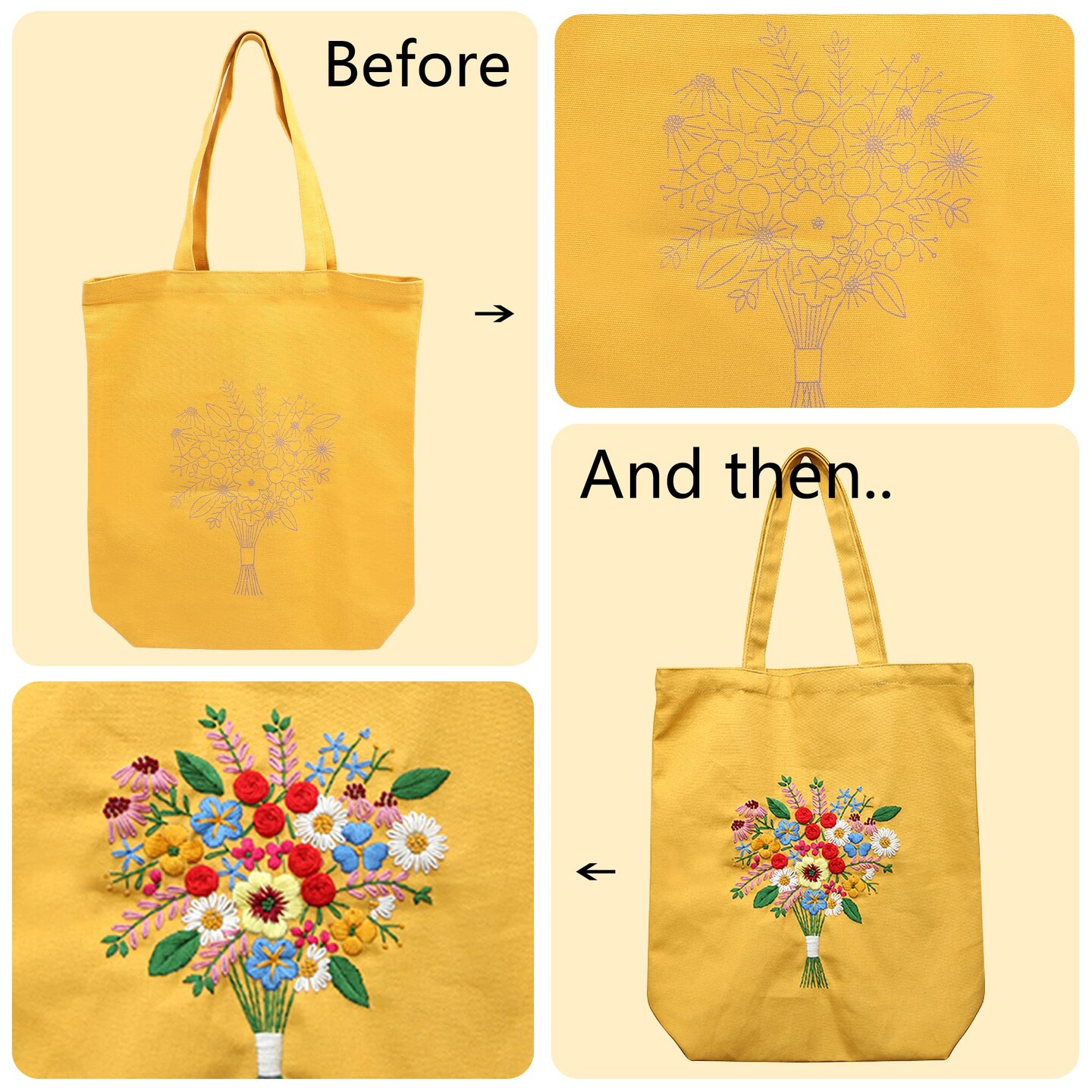 Canvas Tote Bag Embroidery Kit with Pattern for Beginners, Arts and DIY Crafts Kits for Adults, Include Instructions Embroidery Bag, Embroidery Hoops, Color Threads and Tool (Yellow)
