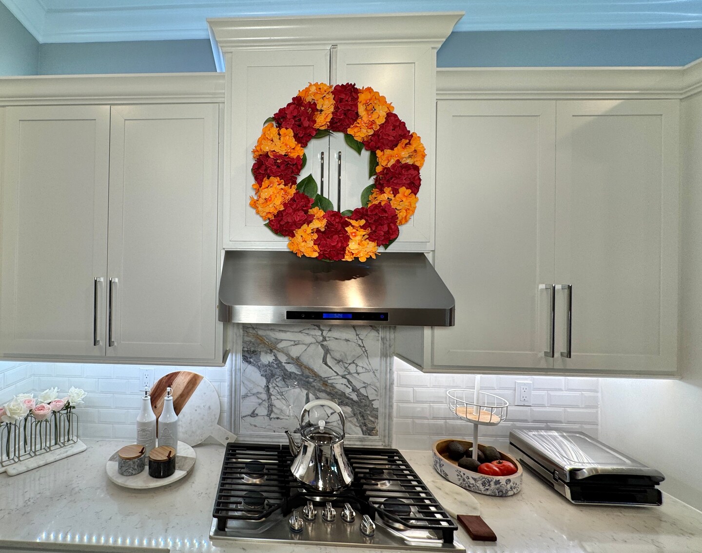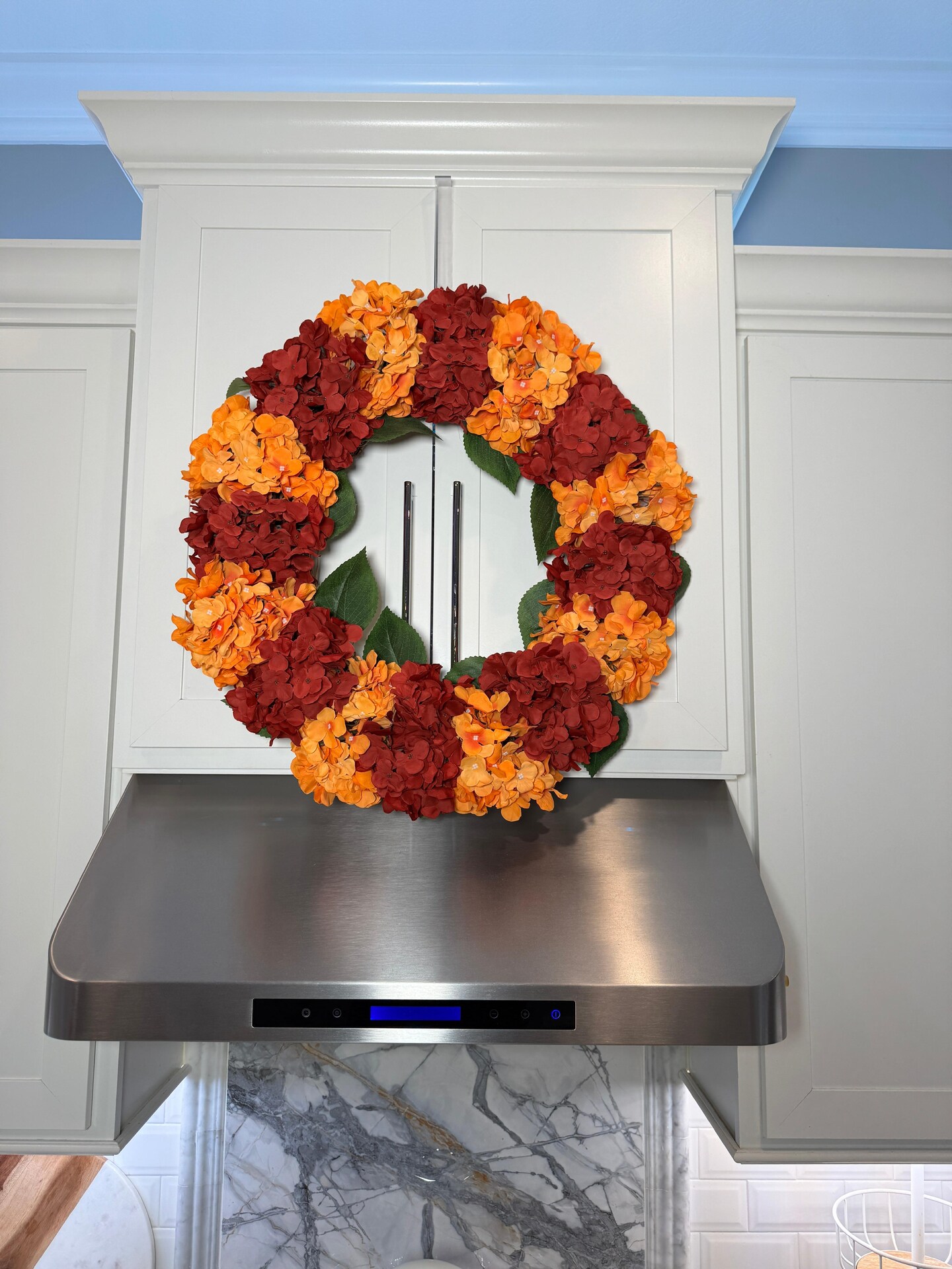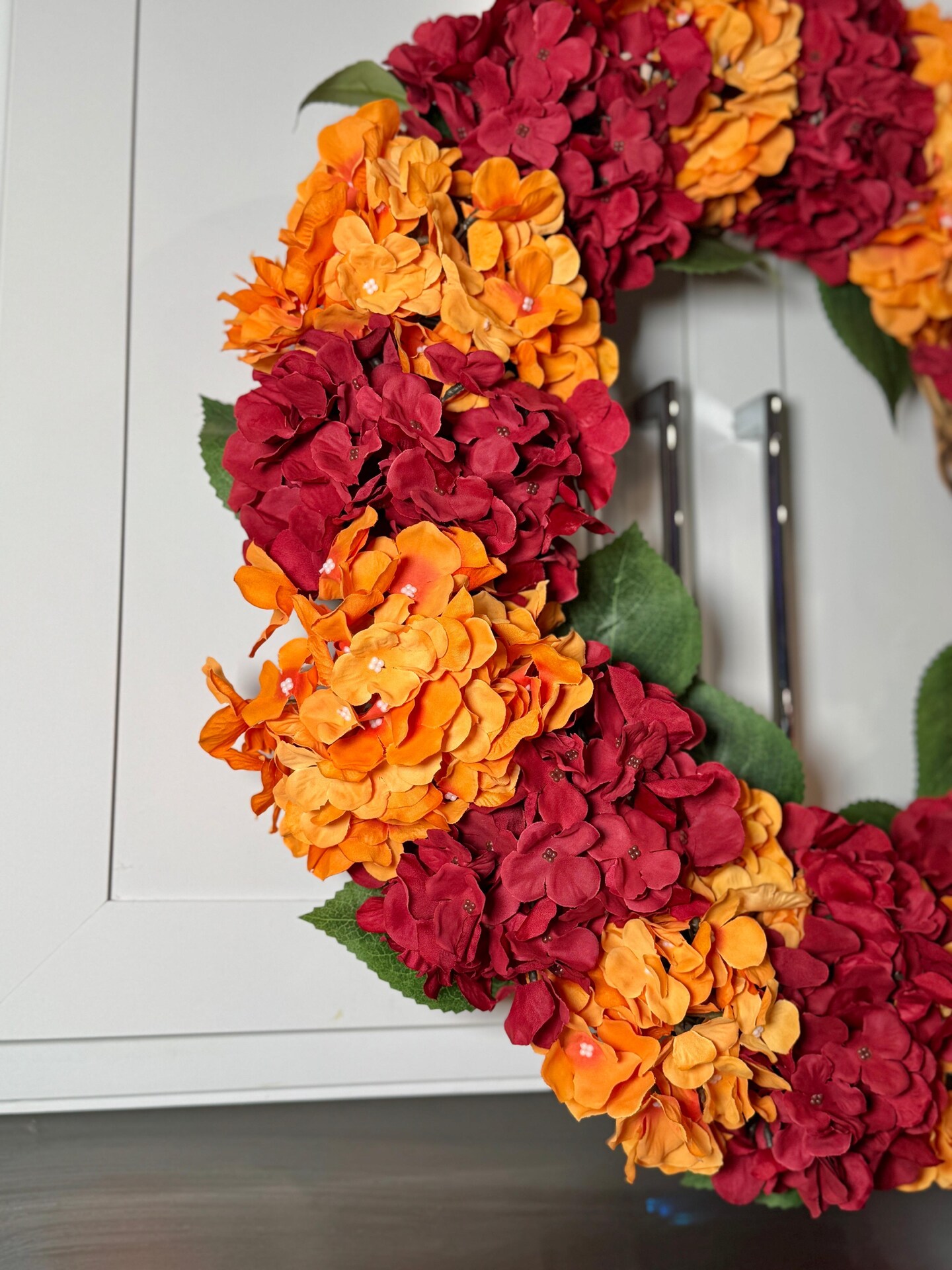 Capri Fall Autumn Hydrangea Wreath Orange Burgundy Red Artificial Flowers 23'' Halloween Seasonal Decor