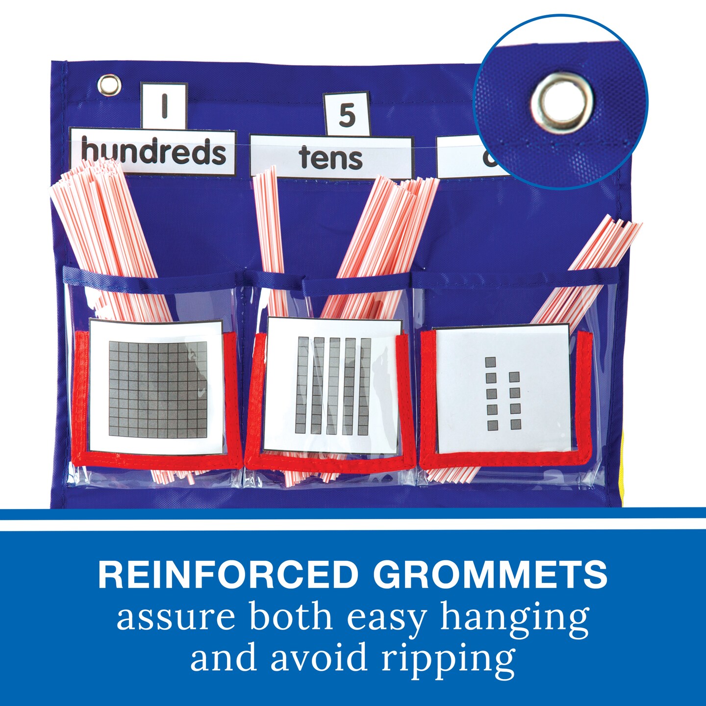 Carson Dellosa 12.75" x 15.25" Blue Deluxe Math Pocket Chart, Counting Caddy With Number, Base Ten, and Blank Cards, Straw Place Value Manipulatives, Homeschool and Classroom Organization