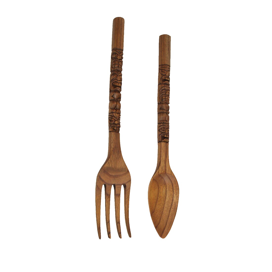 Carved Tiki Spoon & Fork Wooden Wall Decor Art Utensil Decoration Set