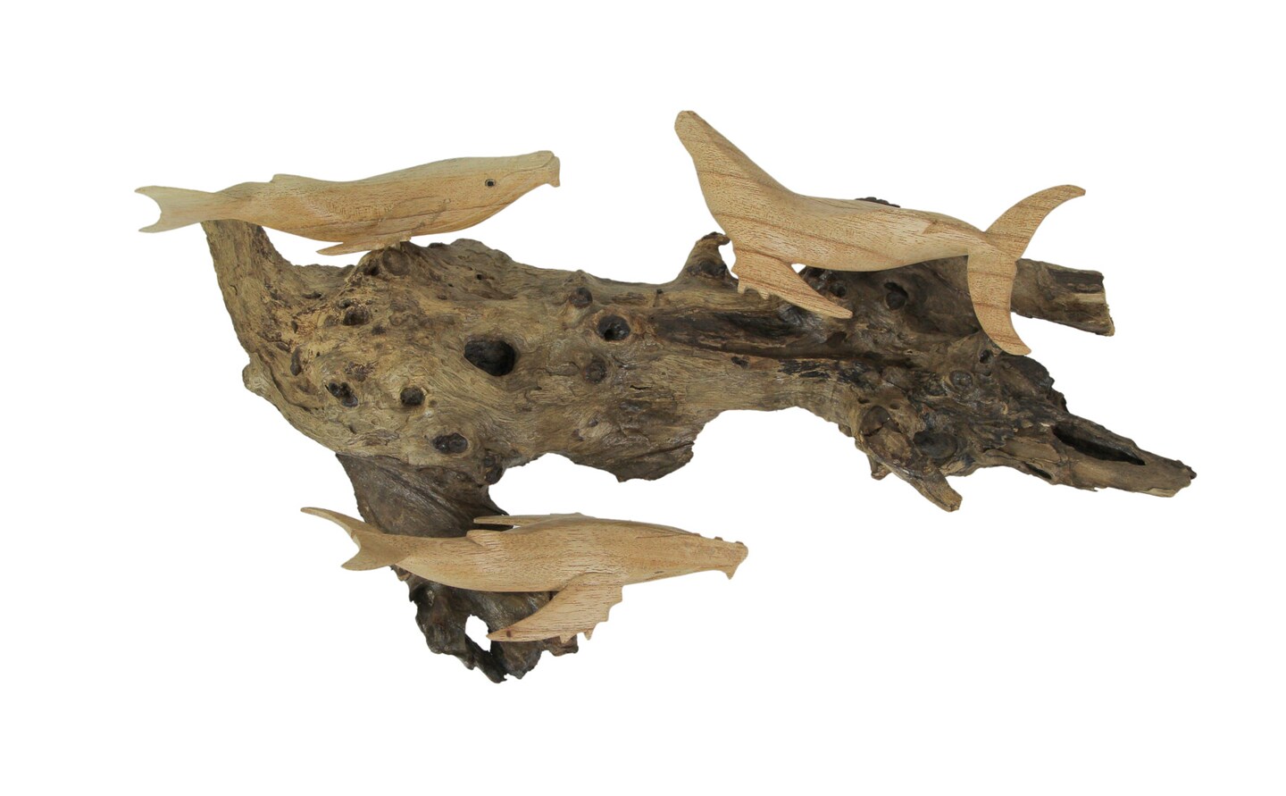 Carved Wood Humpback Whale Trio on Driftwood Base Wall Hanging