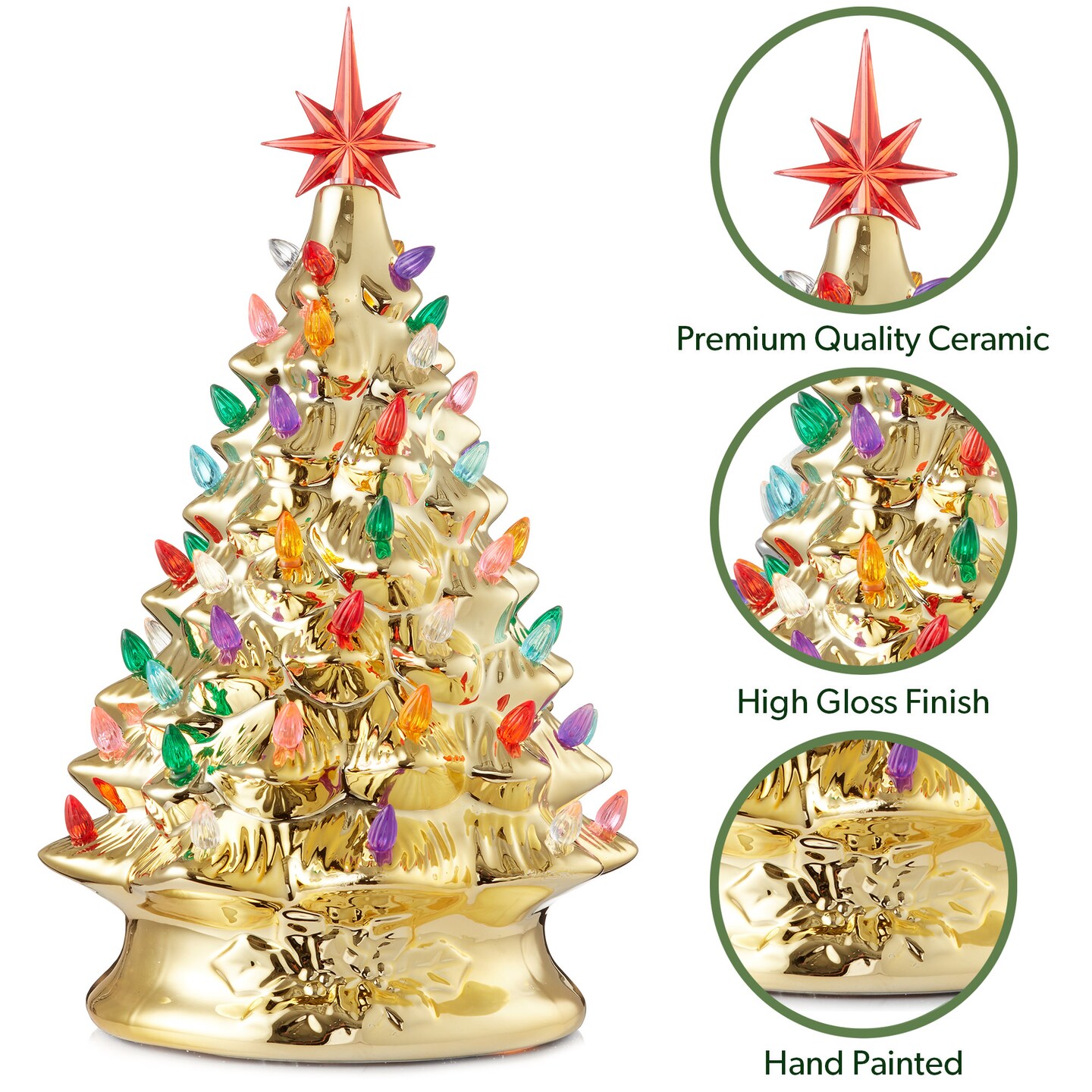 Casafield Hand Painted Ceramic Christmas Tree, Gold 15-Inch Pre-Lit Tree with 128 Multi Color Lights and 2 Star Toppers