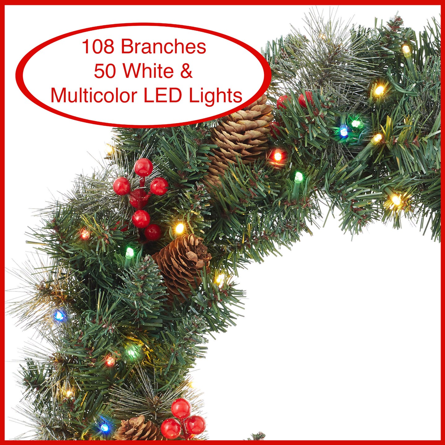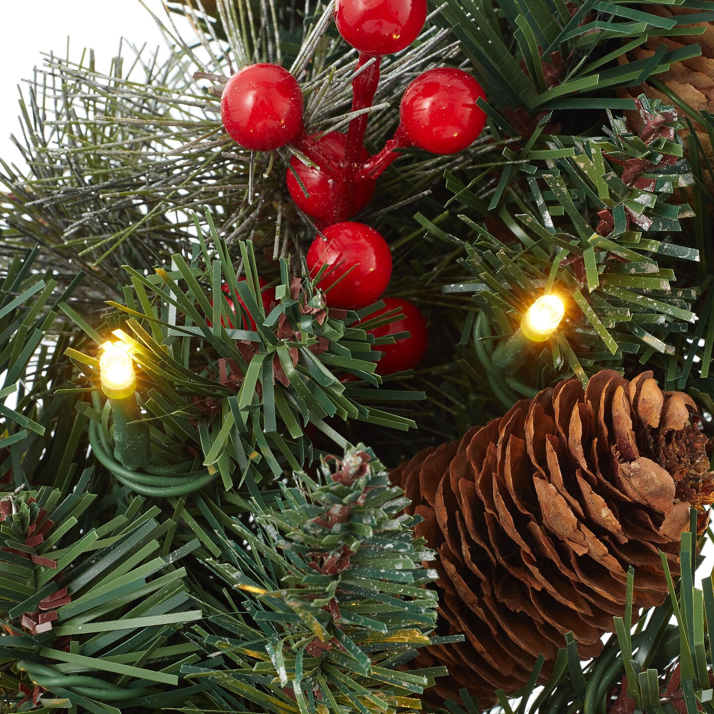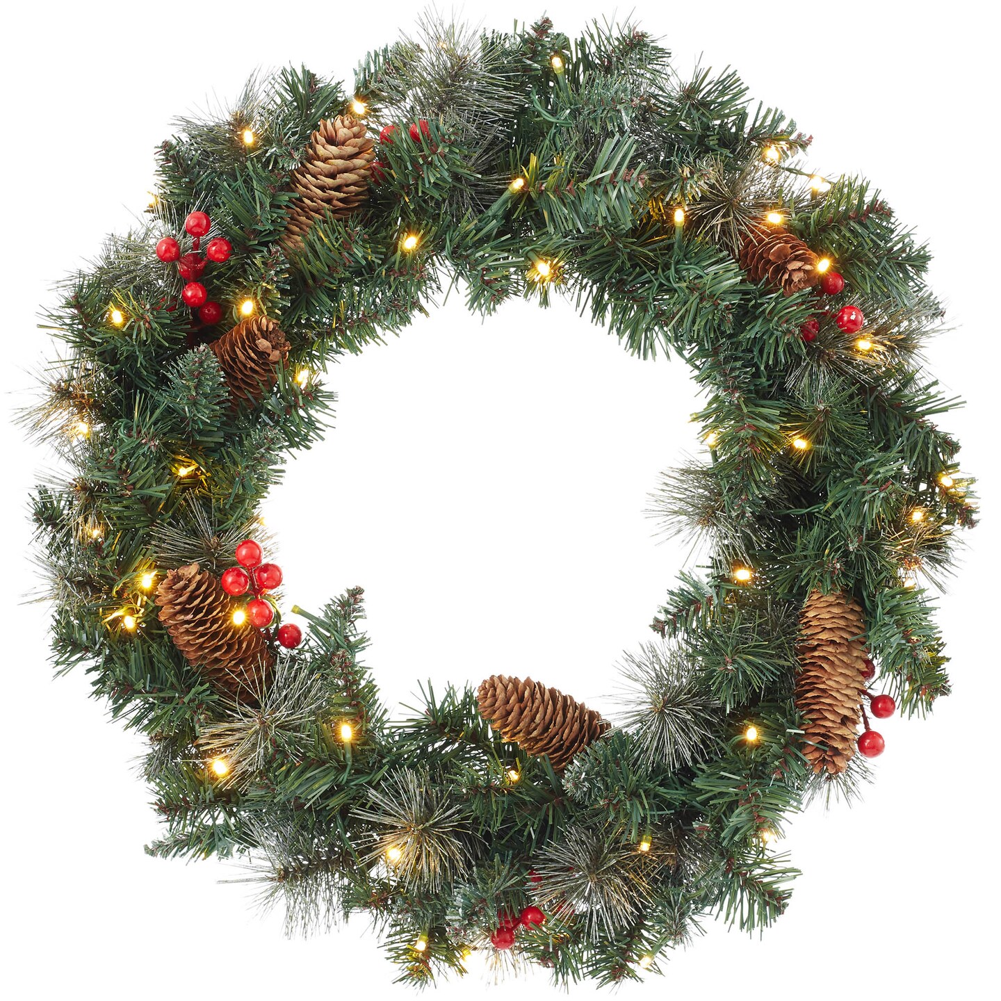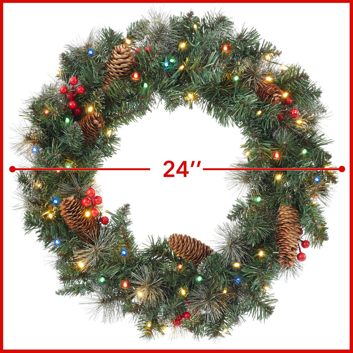 Casafield Pre-Lit Artificial Christmas Wreath for Front Door, Window or Mantel, Green Fir with White Lights and Pinecones Indoor/Outdoor Holiday Decor, 24 Inches