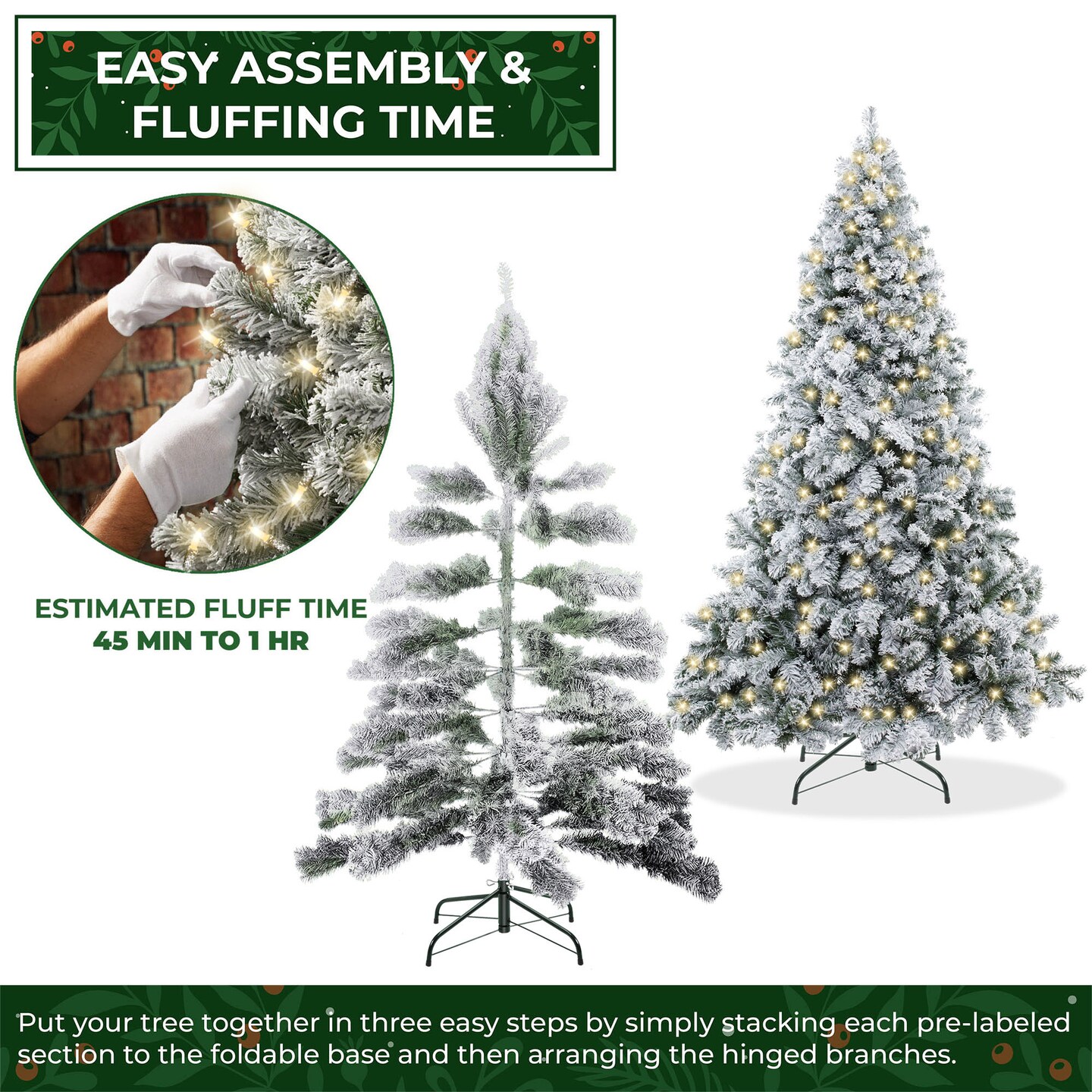 Casafield Realistic Snow-Flocked Pine Artificial Holiday Christmas Tree with Sturdy Metal Stand