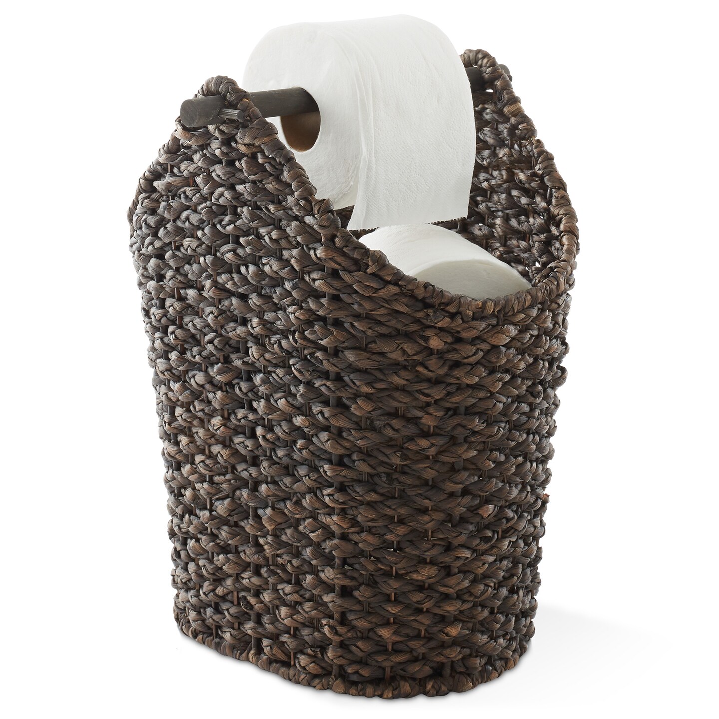 Casafield Toilet Paper Storage Basket with Wood Roll Holder Bar, Braided Water Hyacinth Wicker Bathroom Tissue Storage Organizer