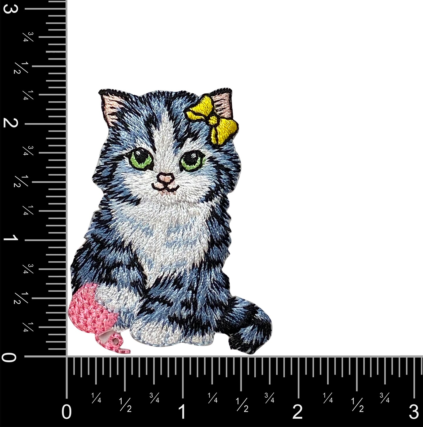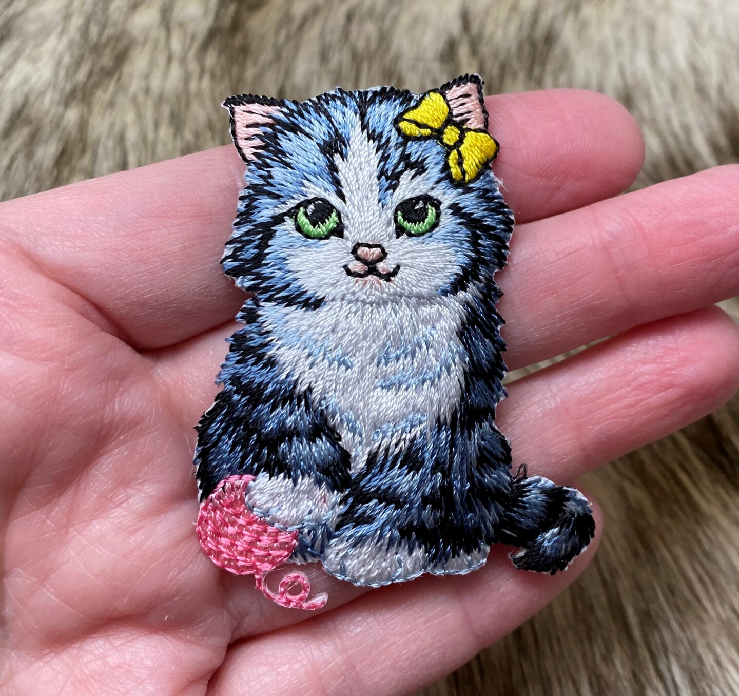 Cat with Yellow Bow, Pink Yarn Ball, Embroidered, Iron on Patch