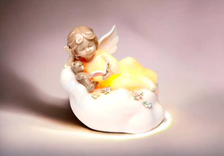 Ceramic Angel Reading with Teddy Bear on Cloud Nightlight, Home Décor, Religious Décor, Religious Gift, Church Décor, Baptism Gift