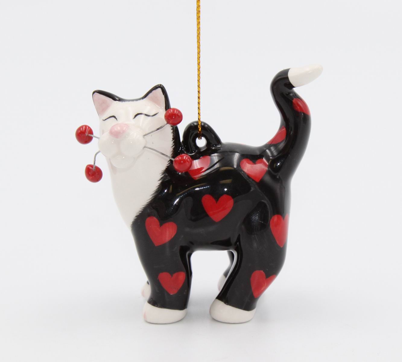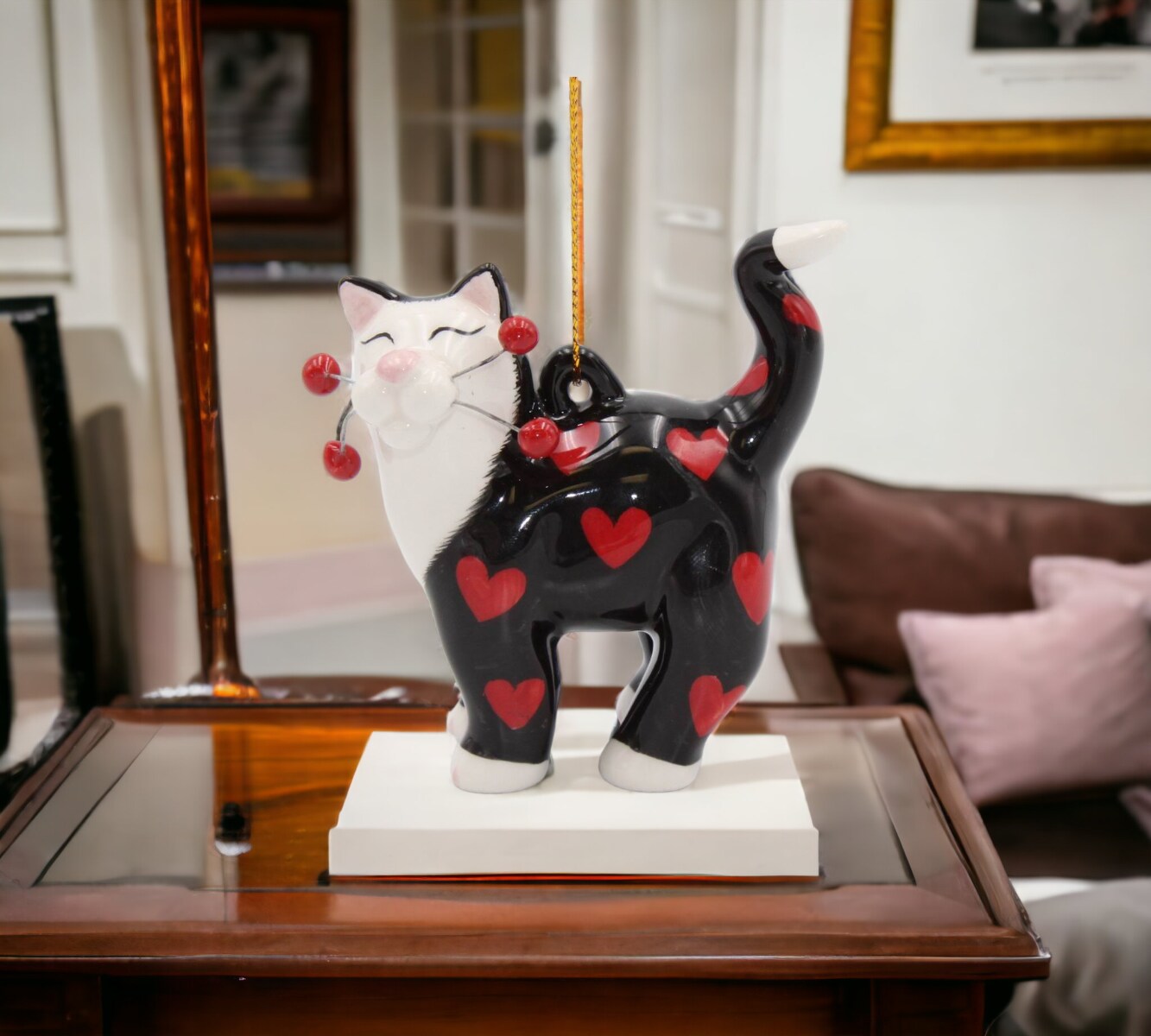 Ceramic Black Cat with Red Hearts Ornament, Home Décor, Gift for Her, Gift for Mom, Valentine’s Day Décor, Romantic Décor, Cat Lover's Gift