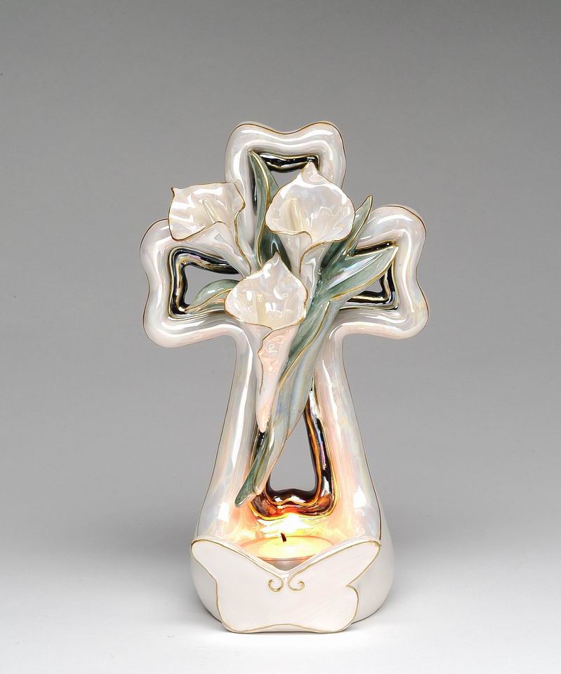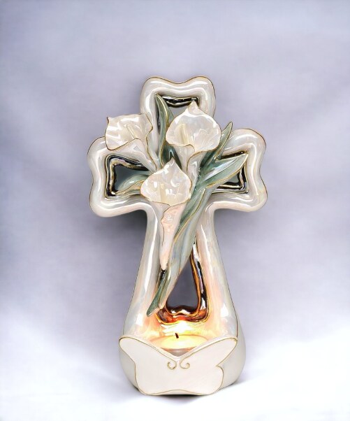 Ceramic Cala Lily Flower with Cross Tealight Candle Holder, Religious Décor, Religious Gift, Church Décor, Church Gift, Baptism Gift