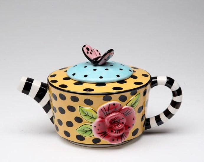 Ceramic Dotted and Striped Yellow Teapot, Gift for Her, Gift for Mom, Kitchen Décor, Tea Party Décor, Café Décor, Kitchen Decor