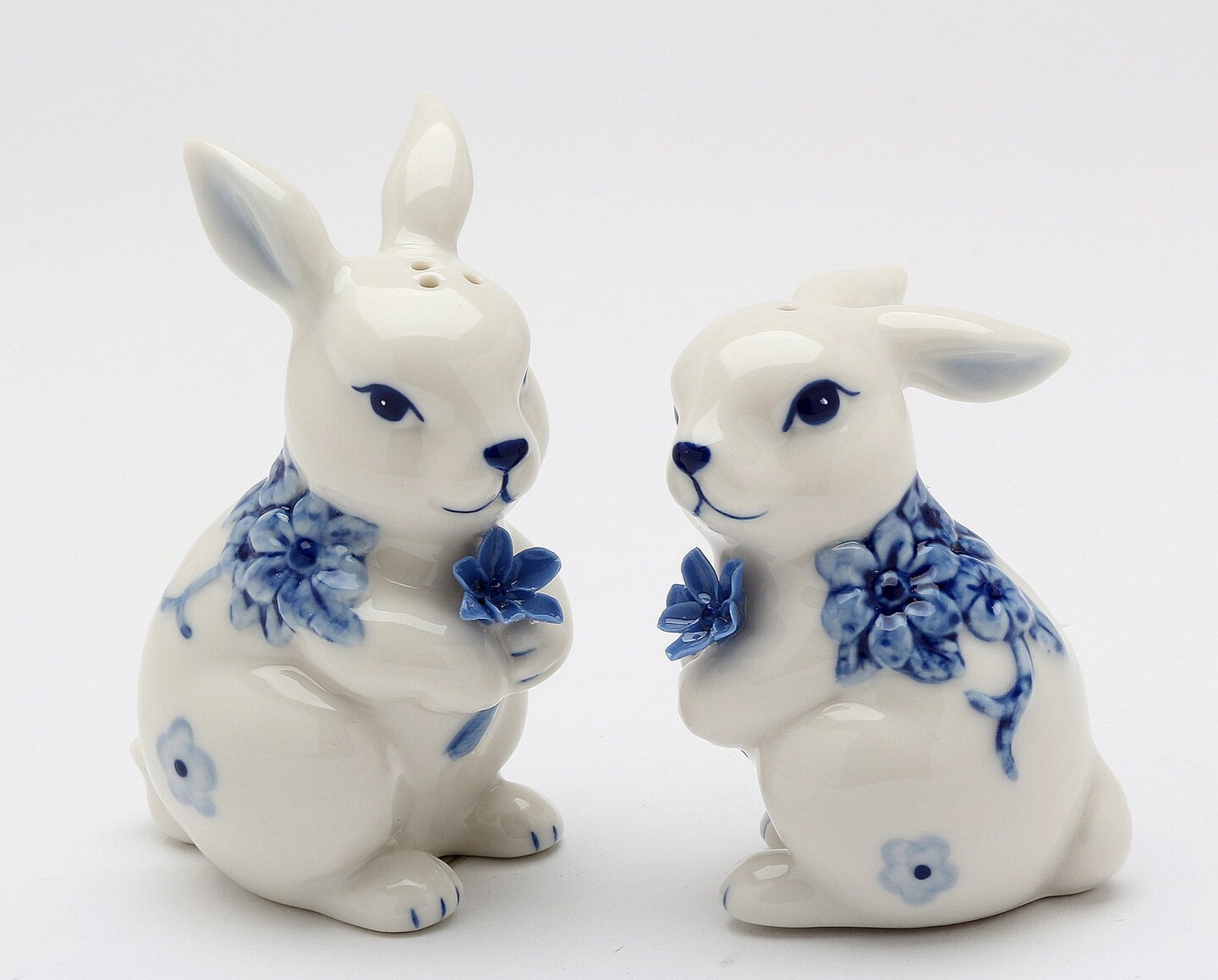 Ceramic Easter Bunny Rabbits with Blue Flowers Salt and Pepper Shakers, Gift for Her or Mom, Kitchen Décor, Spring or Easter Décor