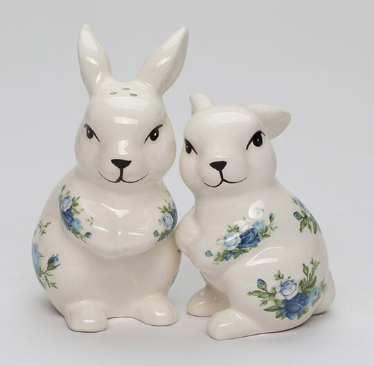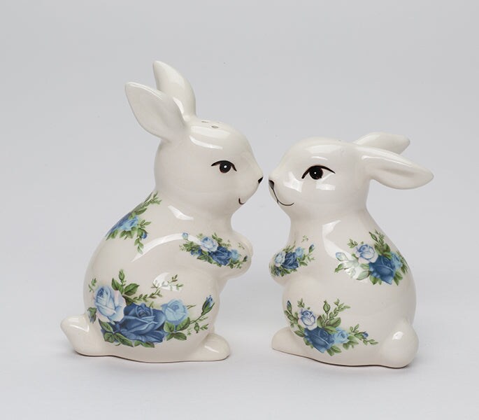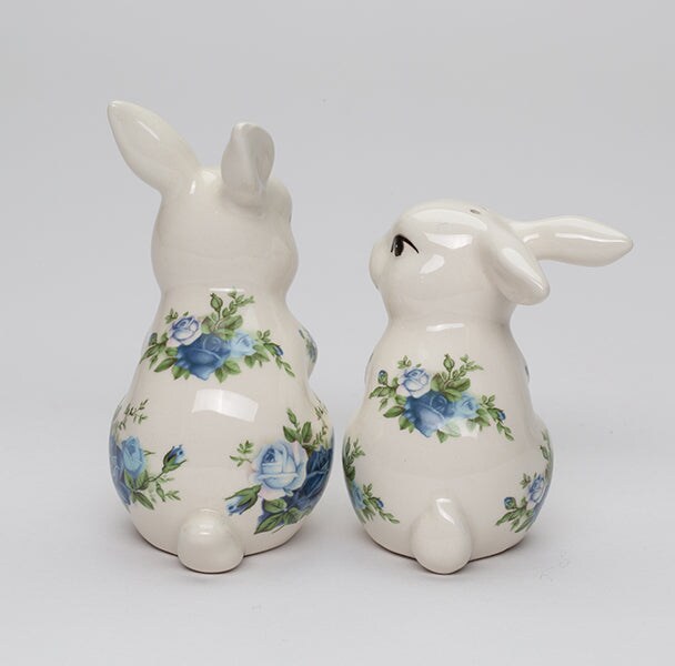 Ceramic Easter Rabbits with Blue Roses Pattern Salt and Pepper Shakers, Spring Decor, Easter Decor, Rabbit Lover Gift
