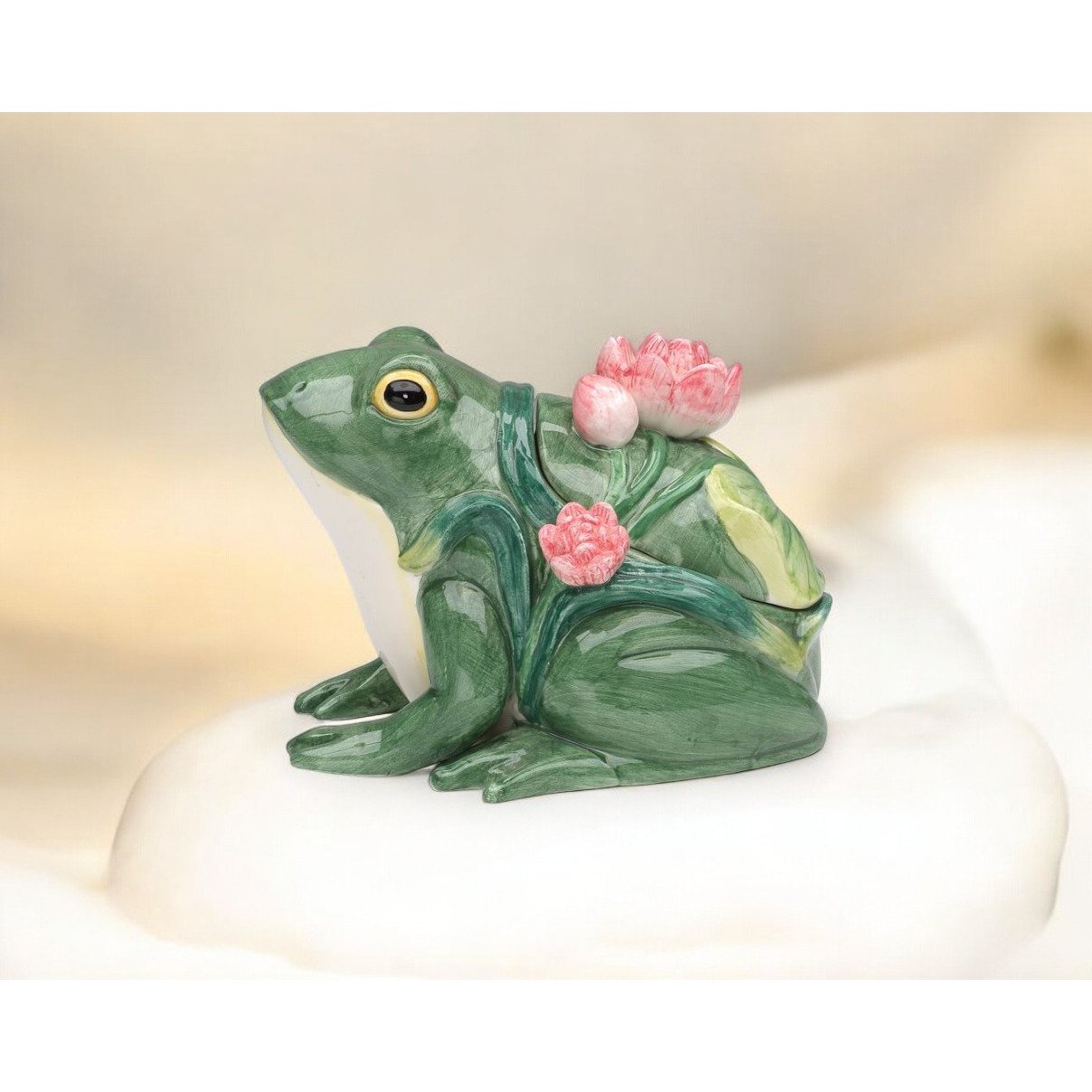 Ceramic Frog Accessory Box With Lotus Flowers 4.25 Inch Gift