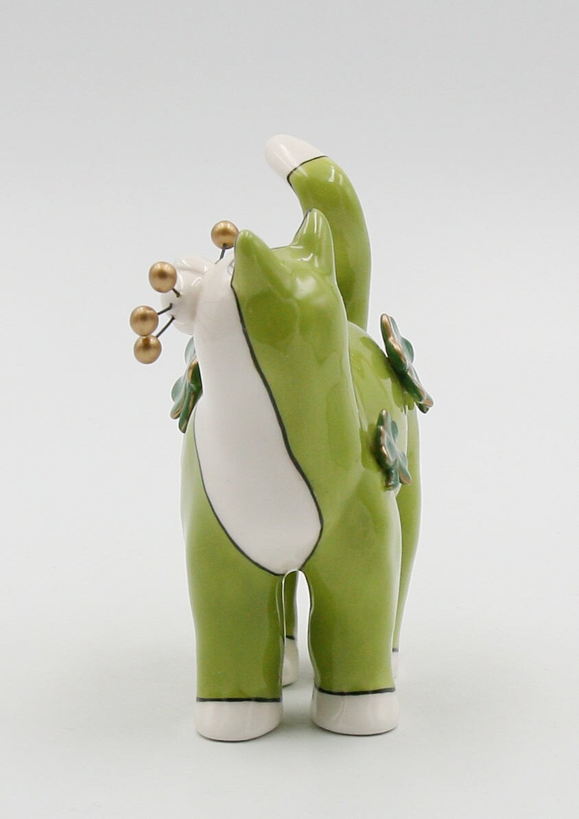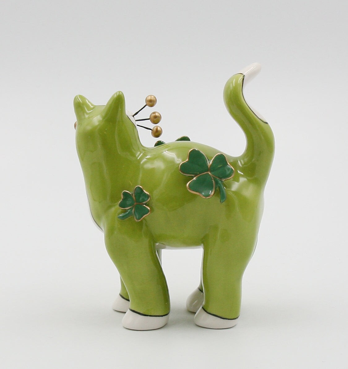 Ceramic Green Cat with Shamrocks and Golden Bead Whiskers Figurine, Home Décor, Gift for Her, Gift for Mom, Irish Saint Patrick’s Day Décor