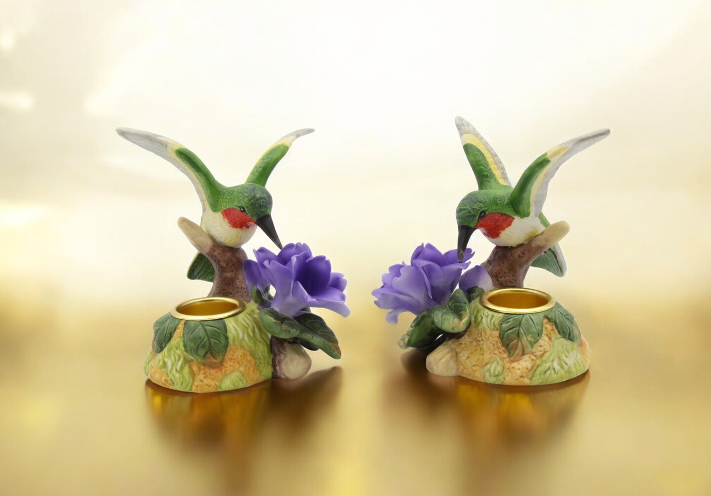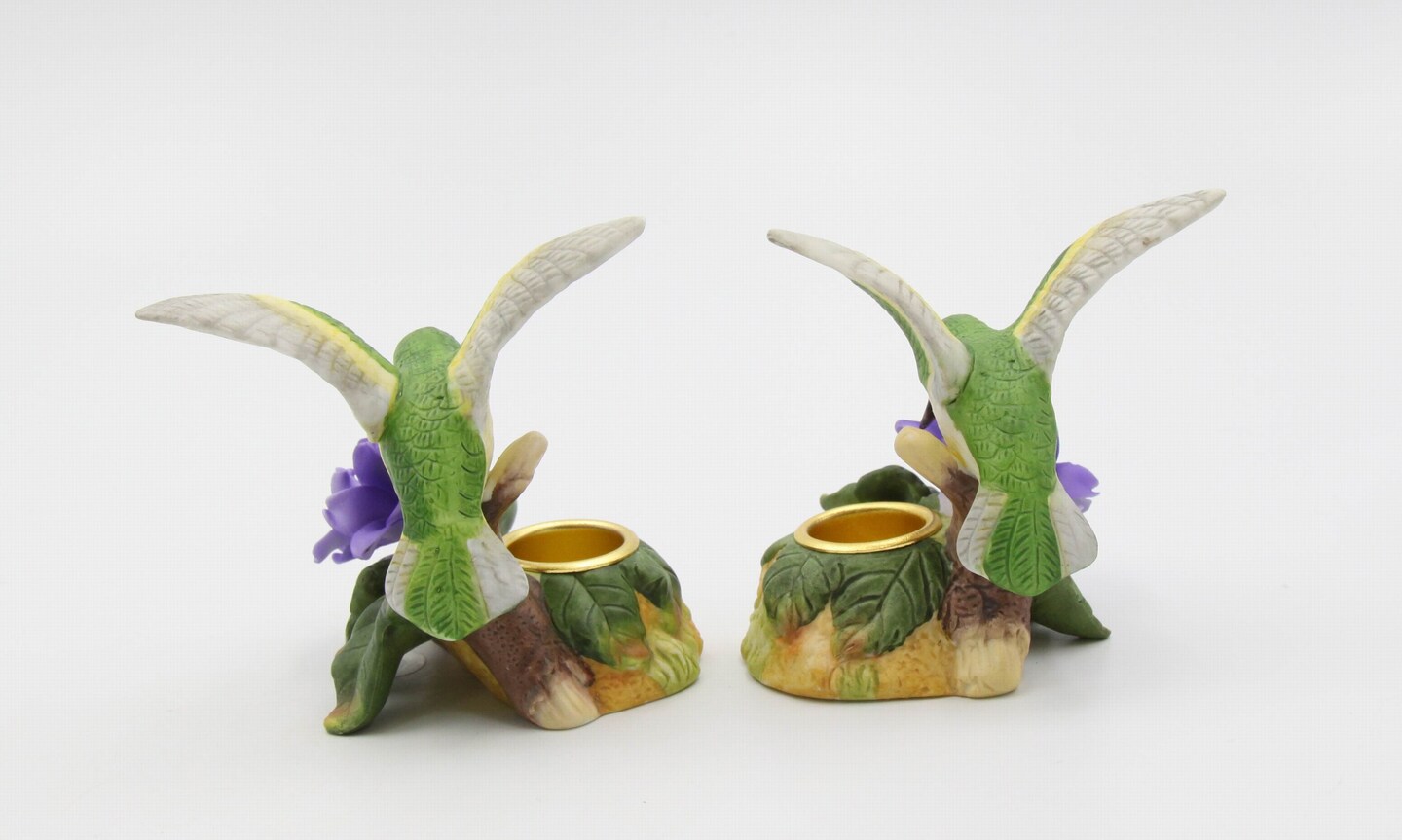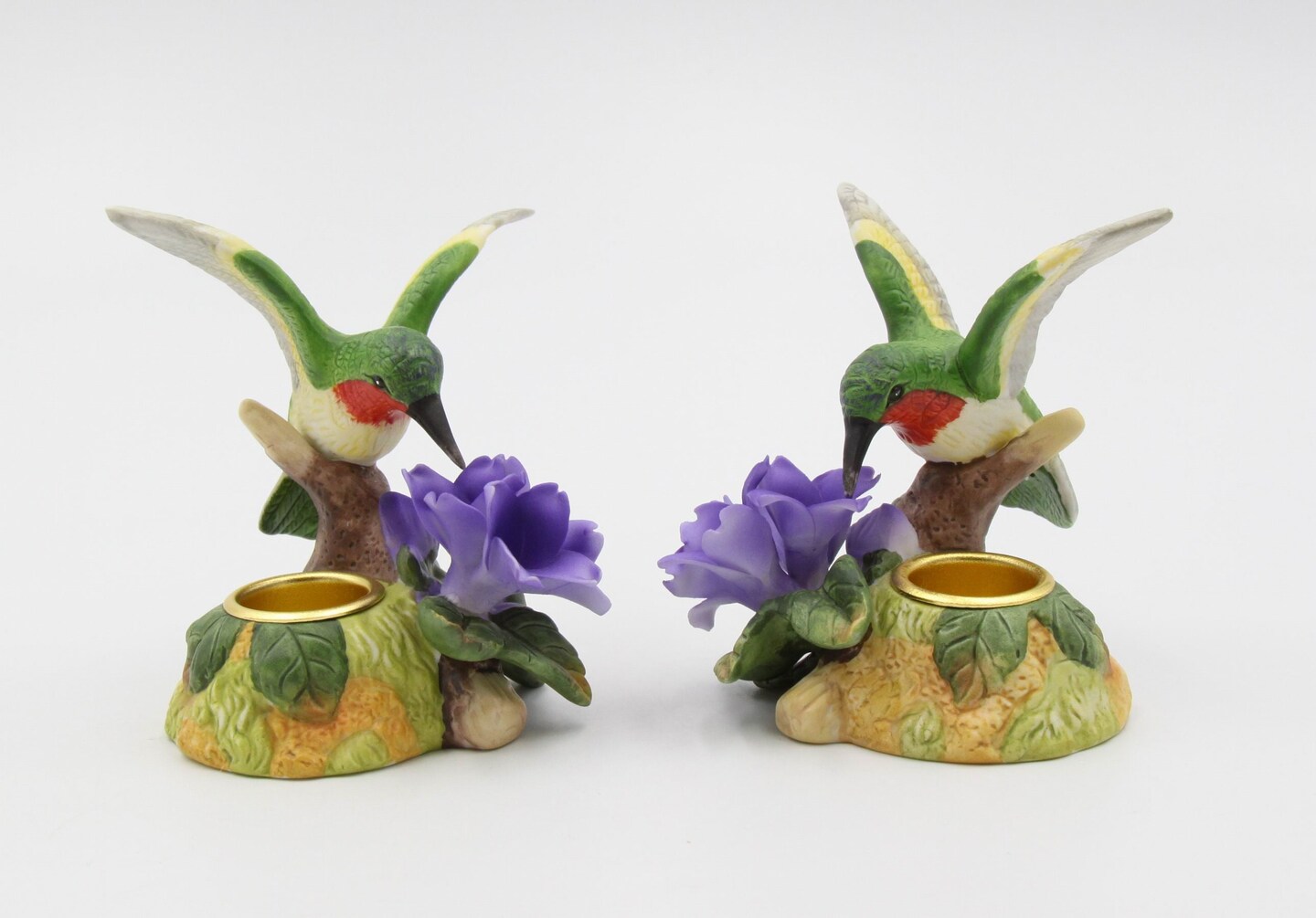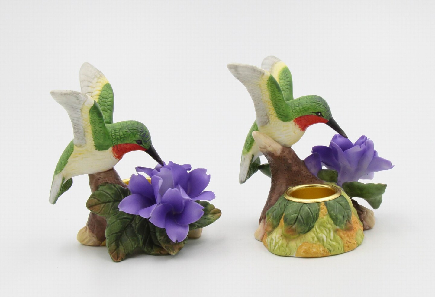 Ceramic Hummingbird with Violet Flower Candleholders - Set of 2, Bird Watcher Gift, Garden Decor, Vintage Decor, Gift for Mom