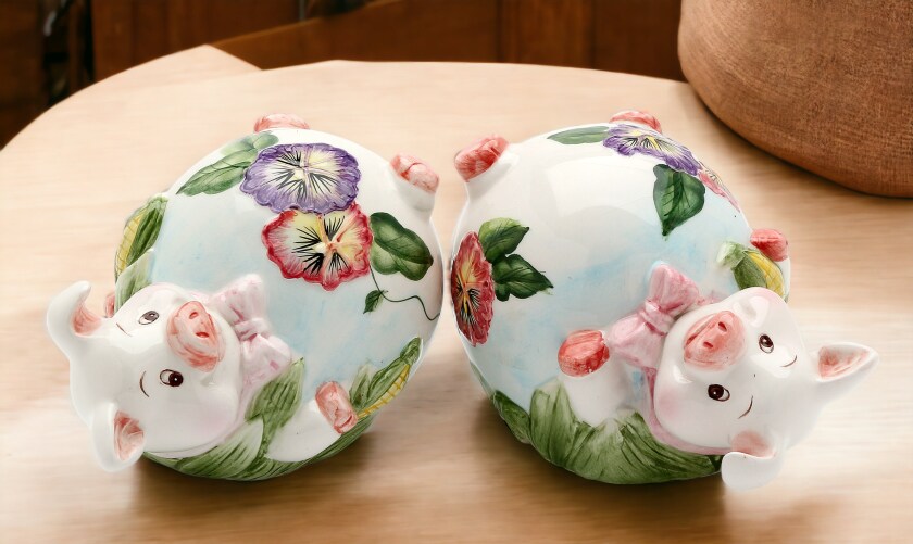 Ceramic Pansy Pig Figurine Two Piece Set, Home Décor, Gift for Her, Mom, Kitchen Décor, Farmhouse Décor, Vintage Decor