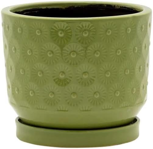 Ceramic Planter Pot with Saucer - Flower Design Moss Green, 5.75 x 5.25