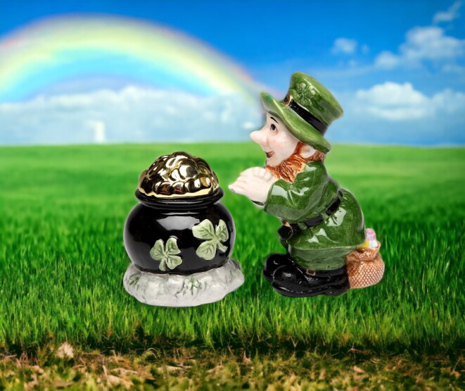Ceramic Pot of Gold with Leprechaun Salt and Pepper Shakers, Gift for Her or Mom, Kitchen Décor, Irish Saint Patrick’s Day Décor