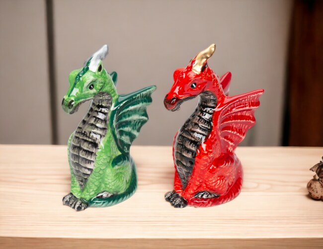 Ceramic Red and Green Medieval Dragon Salt and Pepper Shakers, Game Room Decor, Gift for Him, Gift for Board Game Enthusiast
