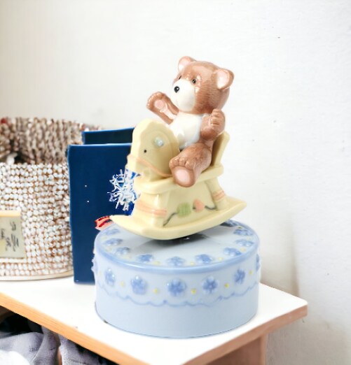 Ceramic Rocking Horse With Bear Music Box, Gift for Her, Gift for New Mom, Nursery Room Decor, Baby Shower Gift