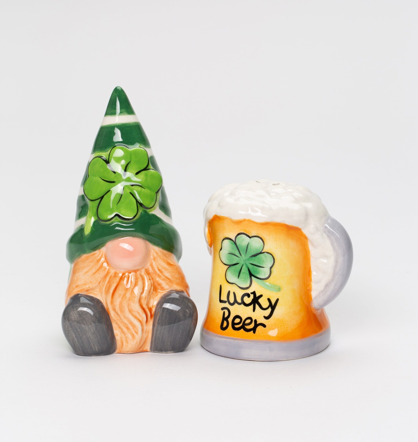 Ceramic Saint Patrick's Day Gnome with Beer Salt and Pepper Shakers, Irish Beer, Fairy Garden Decor, Lucky Beer, Gift for Him, Drinking Buddy Gift