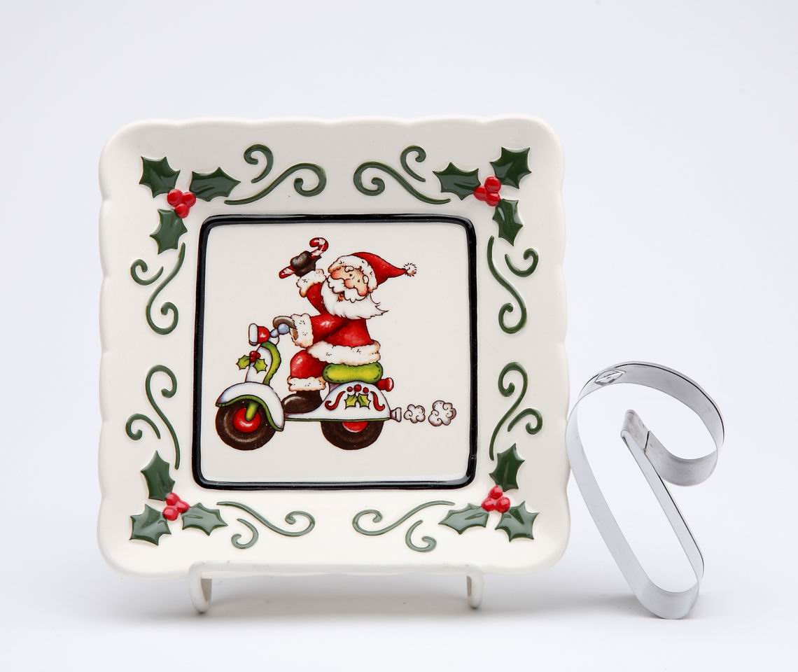 Ceramic Santa With Scooter Plate And Candy Cane Cookie Cutter, Home Décor, Gift for Her, Gift for Mom, Kitchen Décor, Christmas Décor
