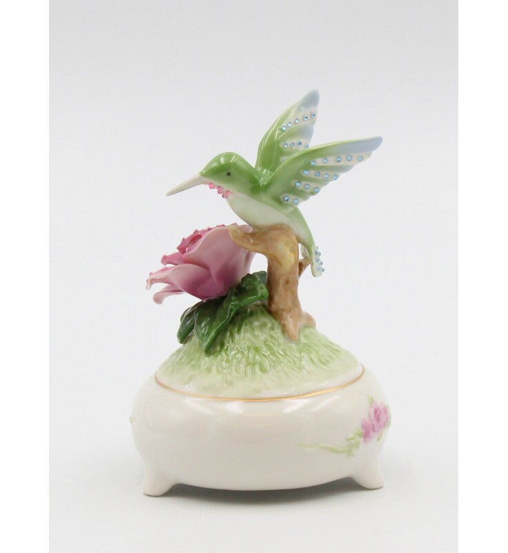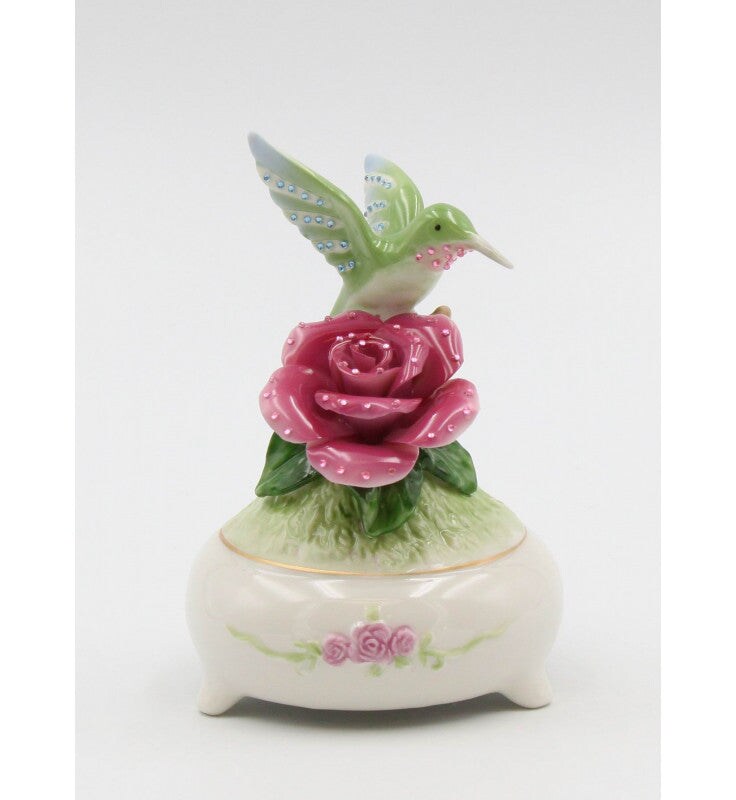 Ceramic Shimmering Hummingbird with Rose Flower Music Box Playing "Fur Elise", Bird Watcher Gift, Gift for Her