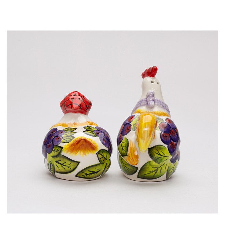 Ceramic Tuscany Rooster & Hen Salt and Pepper with Grape Theme, Farmhouse Kitchen Decor, Winery Decor, Gift for Wine Lover