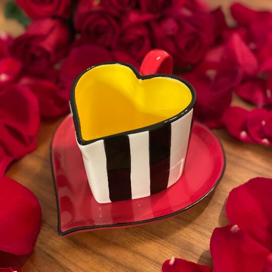 Ceramic Valentines Heart Shaped Striped Cup and Saucer, Gift for Her, Gift for Mom, Gift for Friend or Coworker, Tea Party Décor, Café Decor