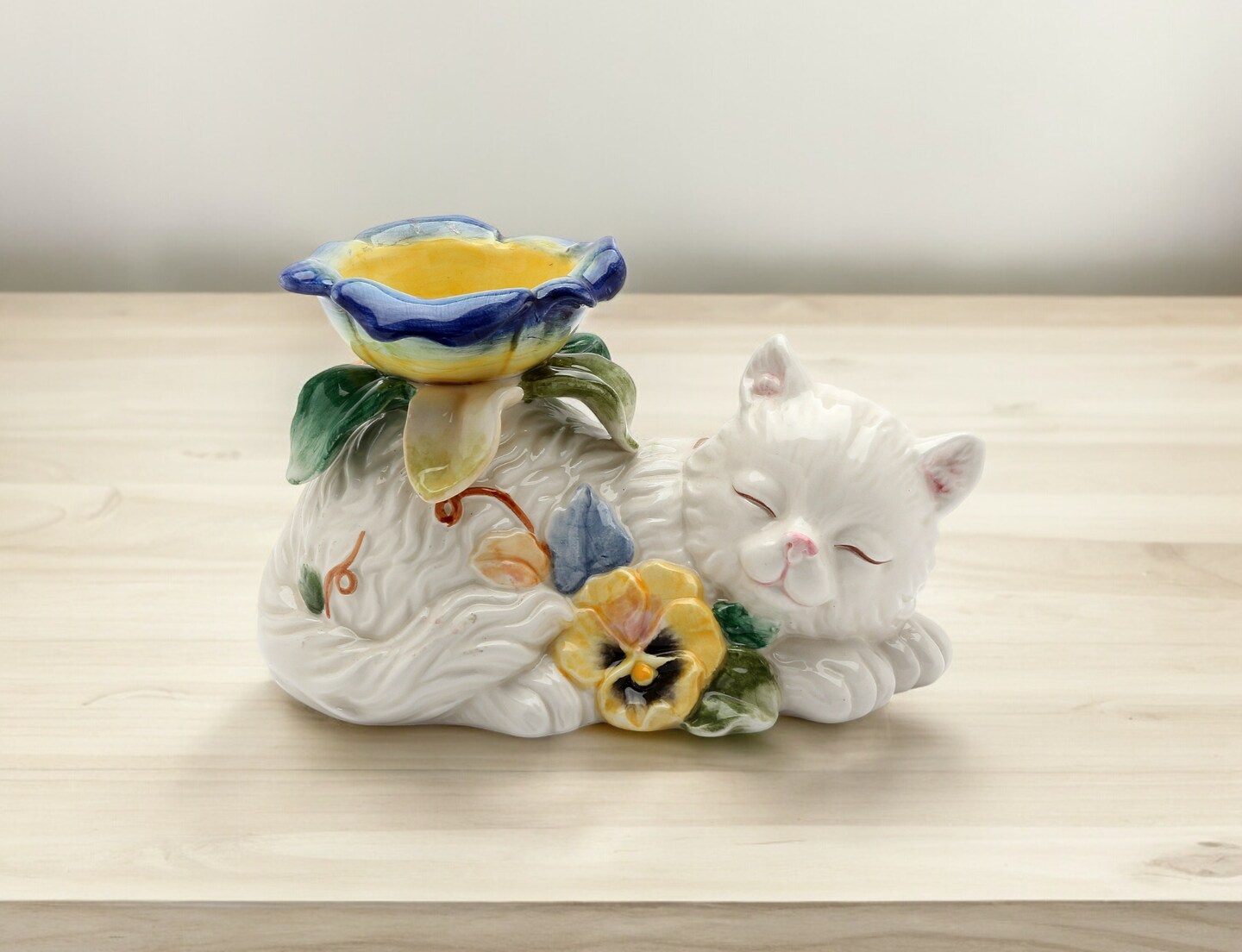 Ceramic White Cat with Pansy Flowers Tealight Candle Holder, Cat Lover Gift, Gift for Her, Gift for Mom