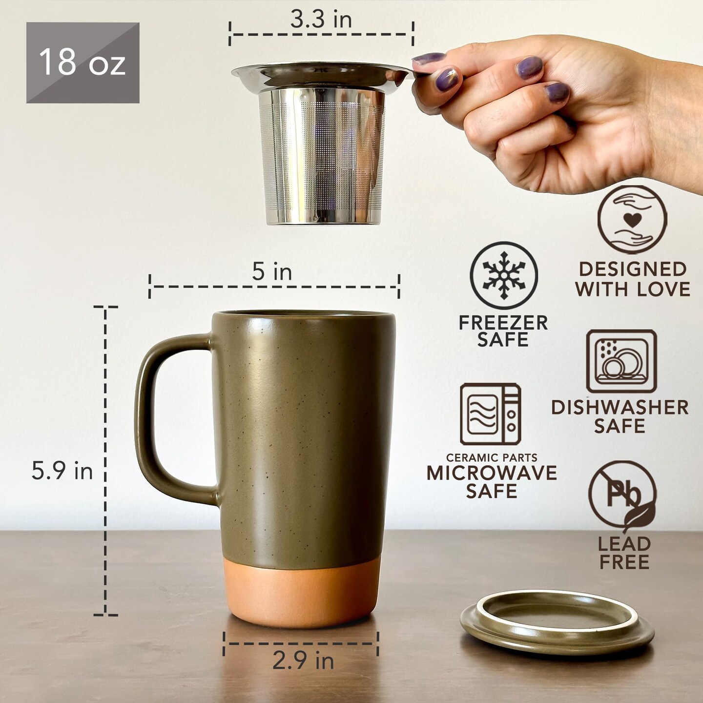Ceramics Large Tea Mug with Loose Leaf Infuser and Ceramic Lid, 18 oz, Portable, Microwave and Dishwasher Safe, Tall Coffee Cup - Rustic Matte Ceramic Glaze, Modern Herbal Tea Strainer, Olive