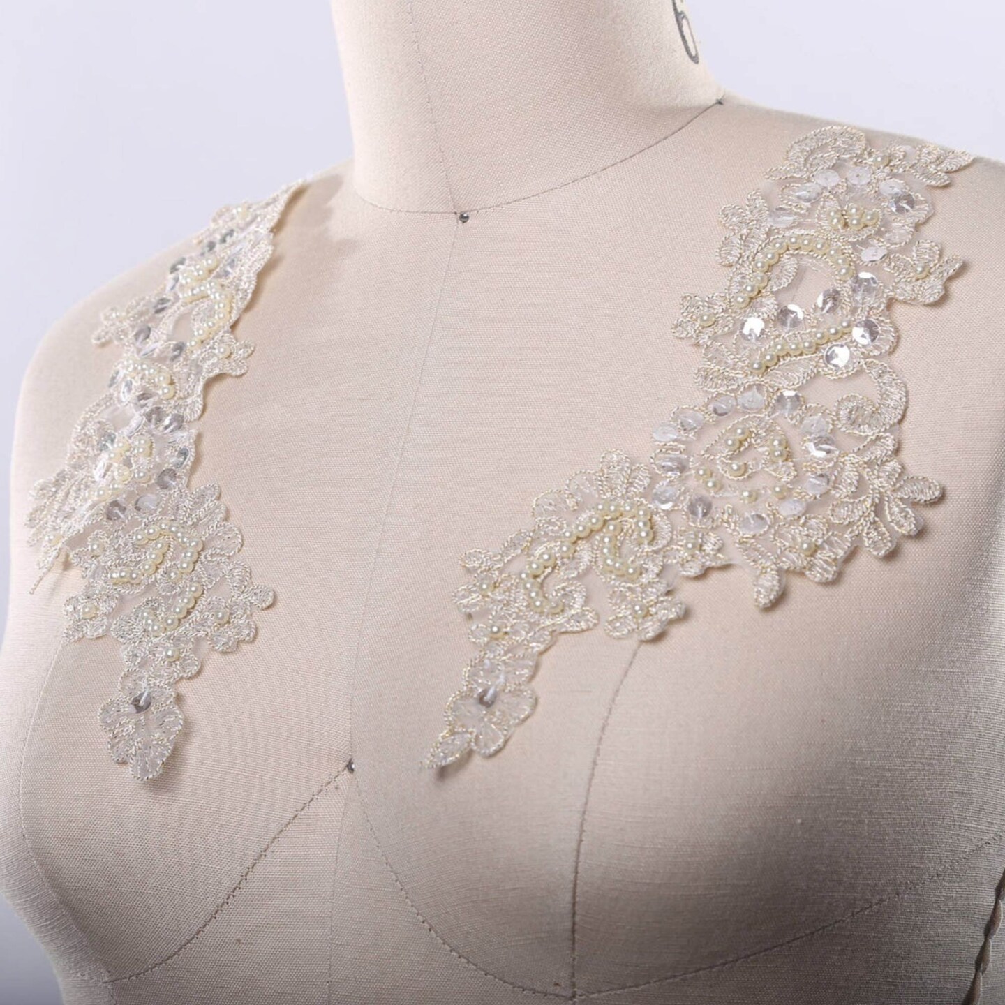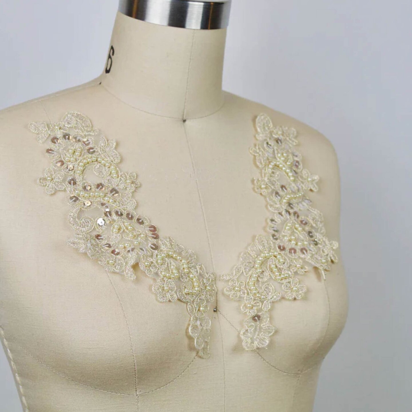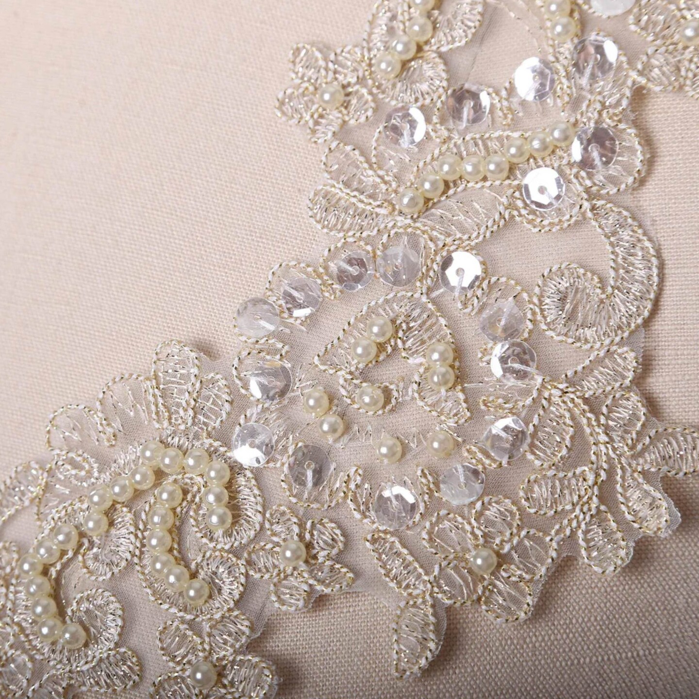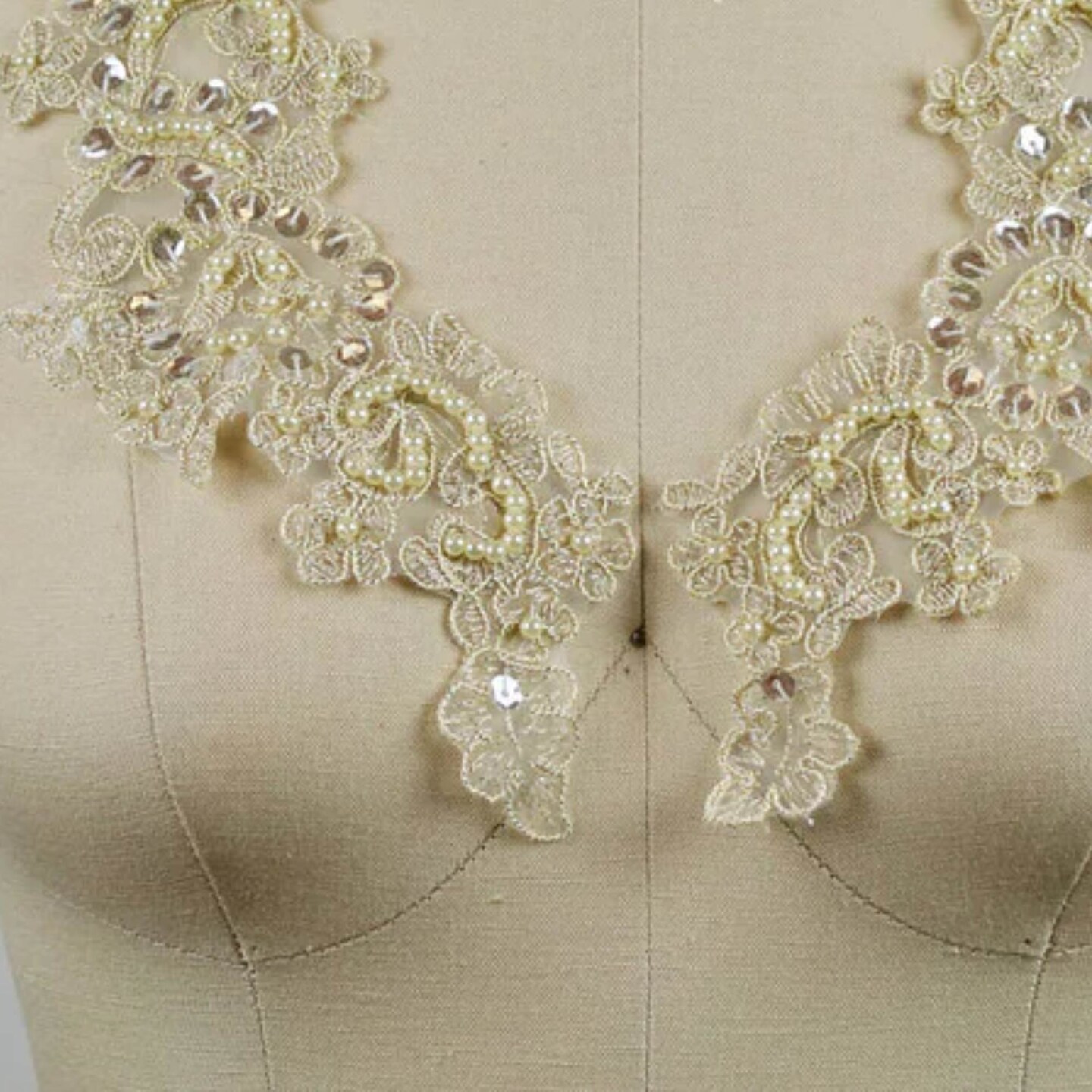 Champagne Gold Beige Lace Patches Set of 2 Beaded Sequined Antique Appliques 9 x 3 Inch