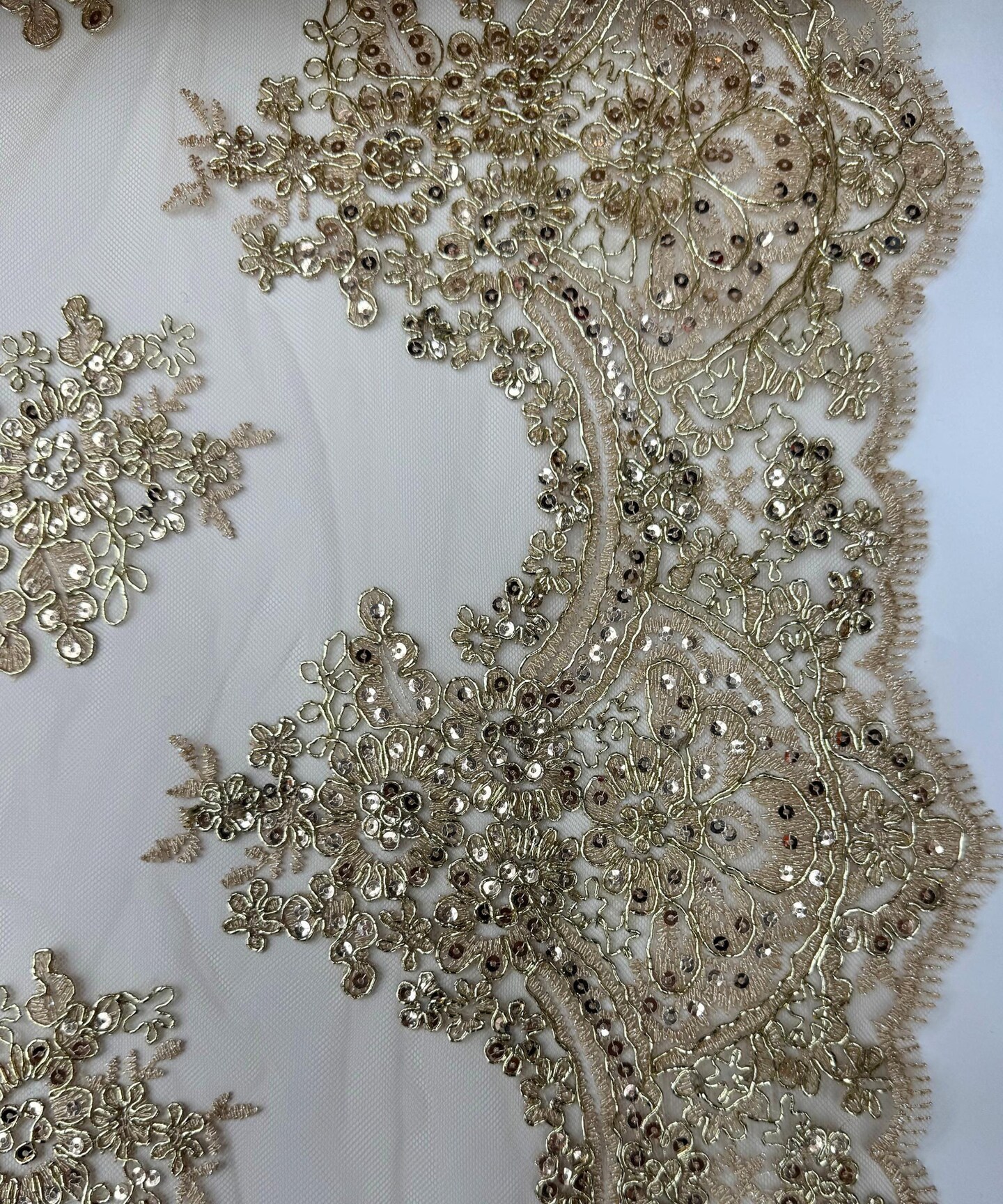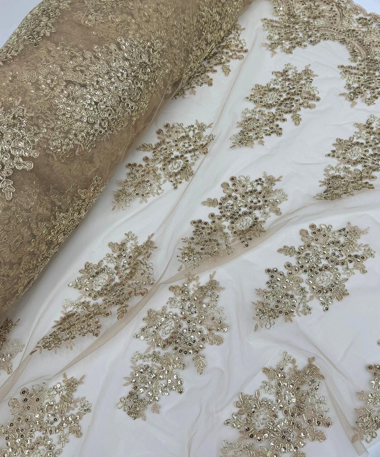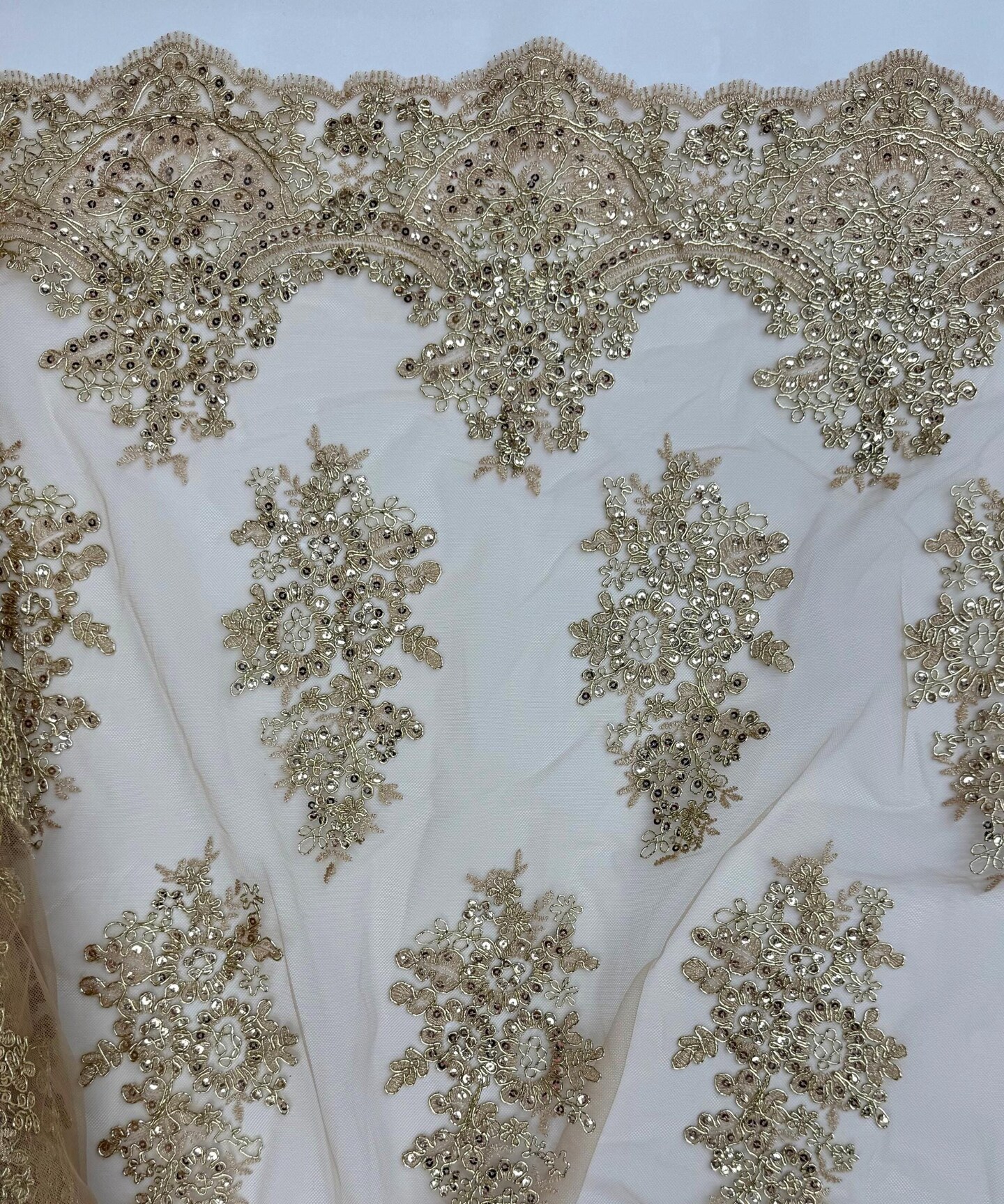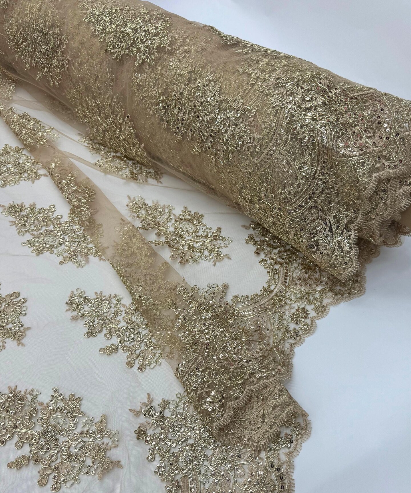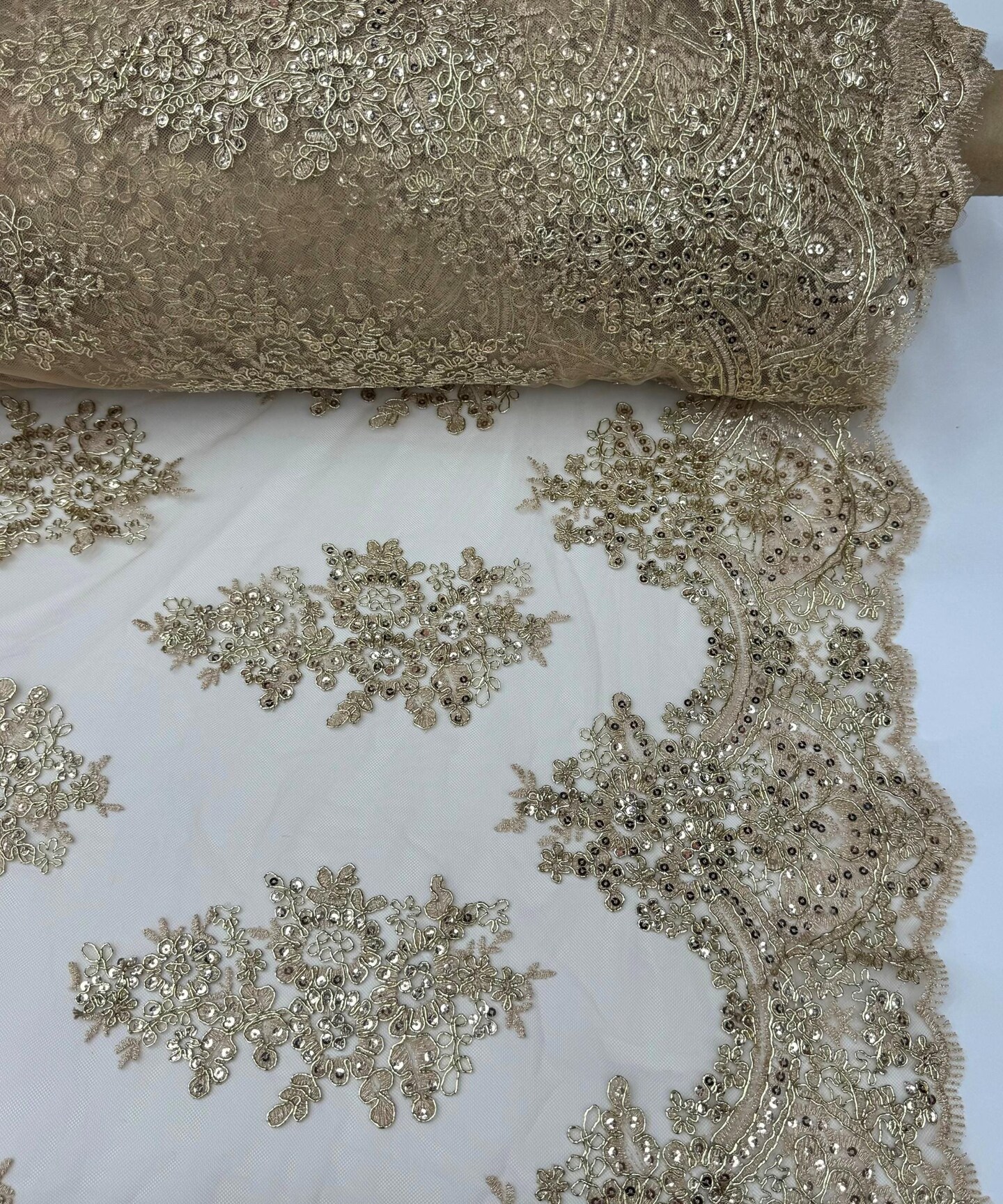 Champagne Sequin Embroidered Lace Fabric by the Yard, 54" Wide Floral Mesh Lace with Double Scalloped Edges