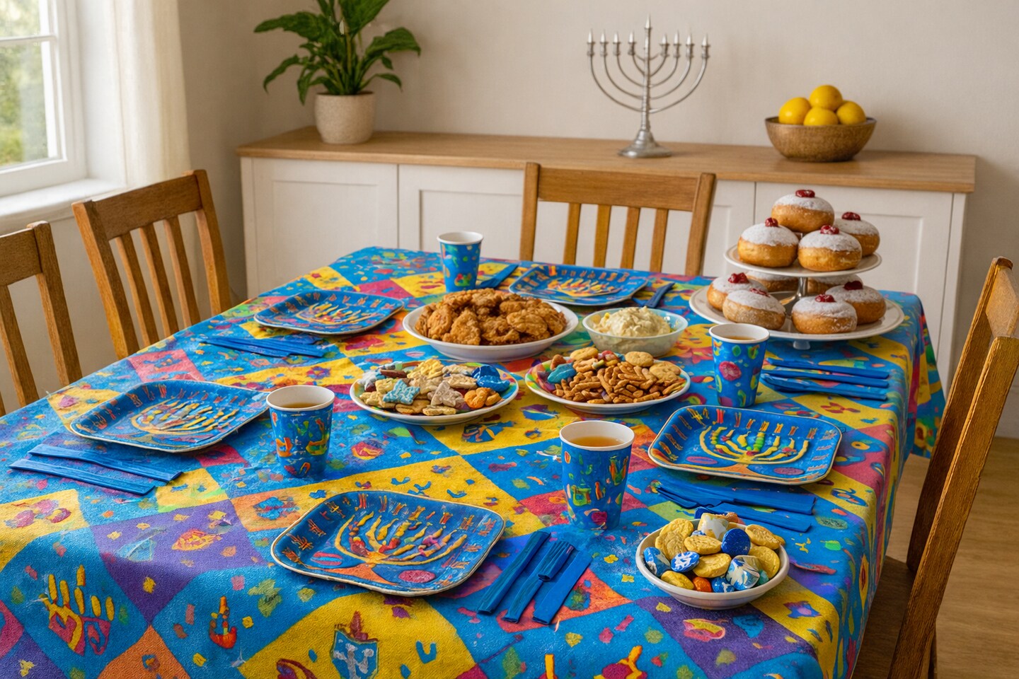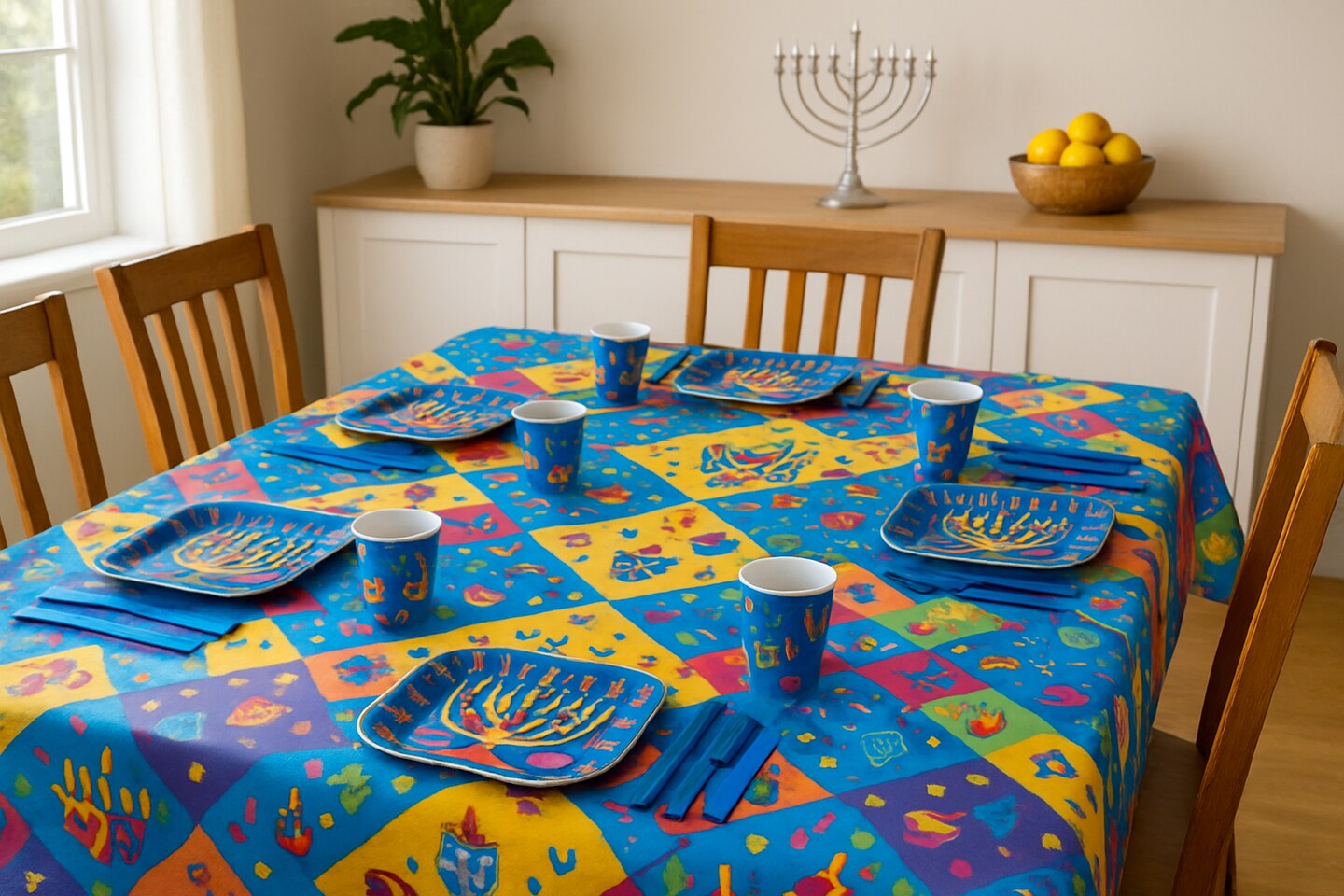 Chanukah Tablecloth, Yiddish Design – Disposable Hanukkah Party & Classroom Table Cover, 1 Pack