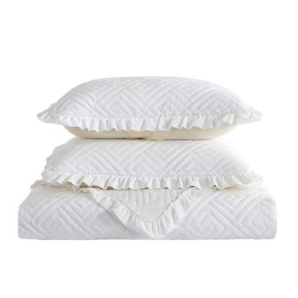 Charcoal Grey Ivory White Velvet Microfiber Geometric Ruffled Quilt Set Hypoallergenic Soft Textured Reversible 3-Piece Bedding with Sham Lightweight Machine Wash Modern King Queen Coverlet