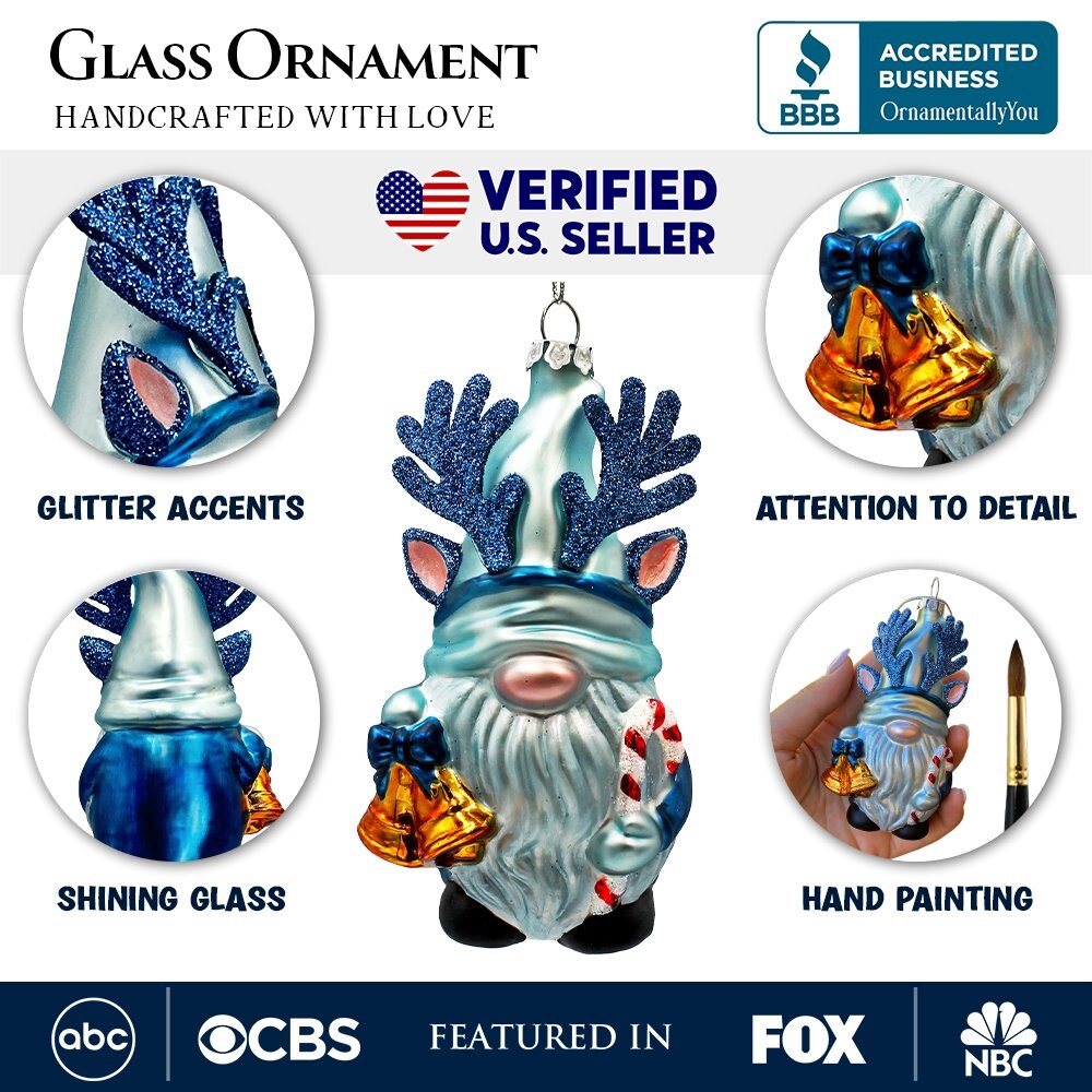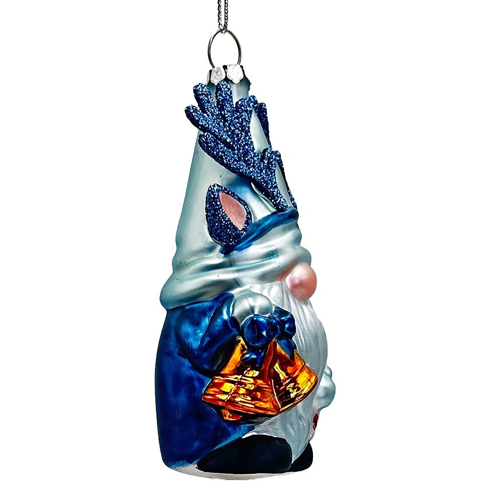 Charming Blue Gnome with Antlers Glass Christmas Ornament