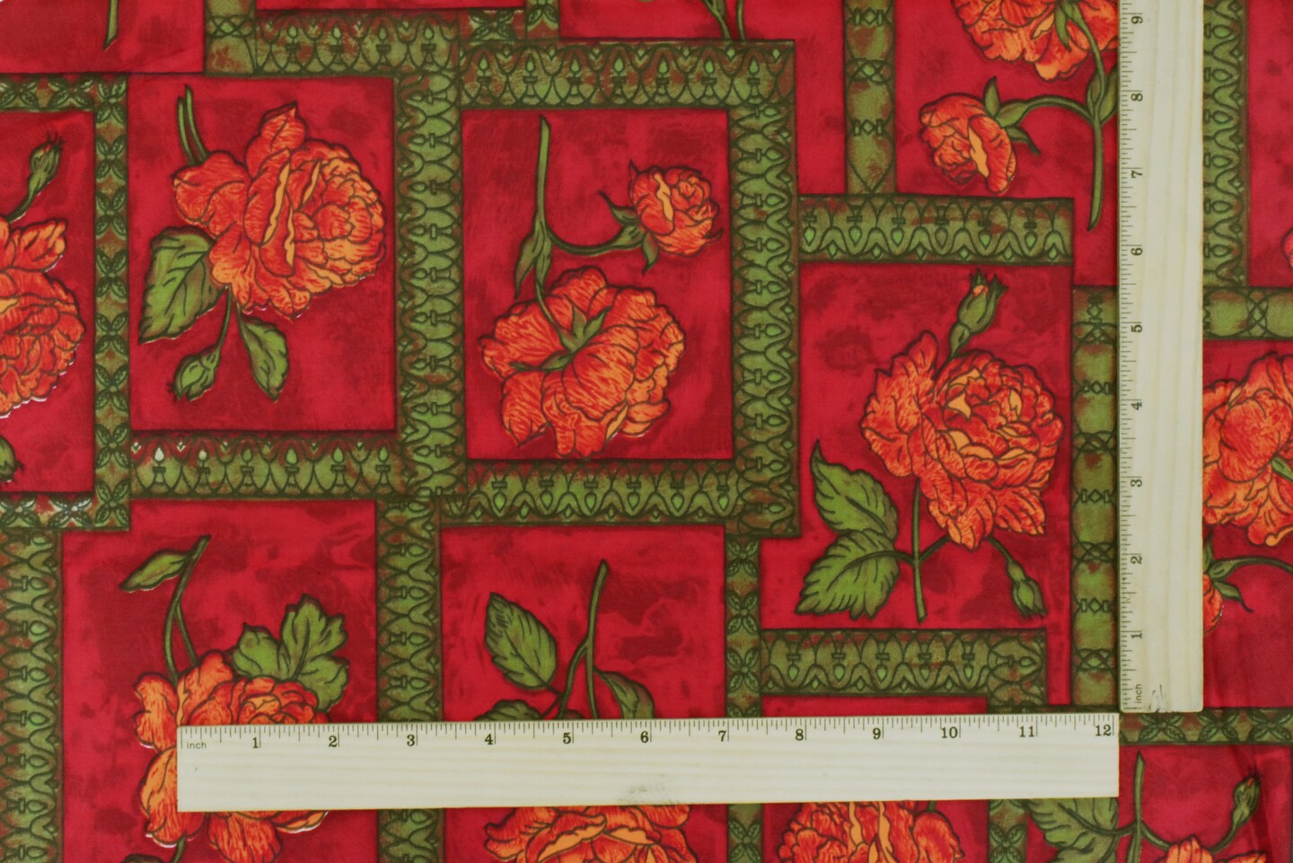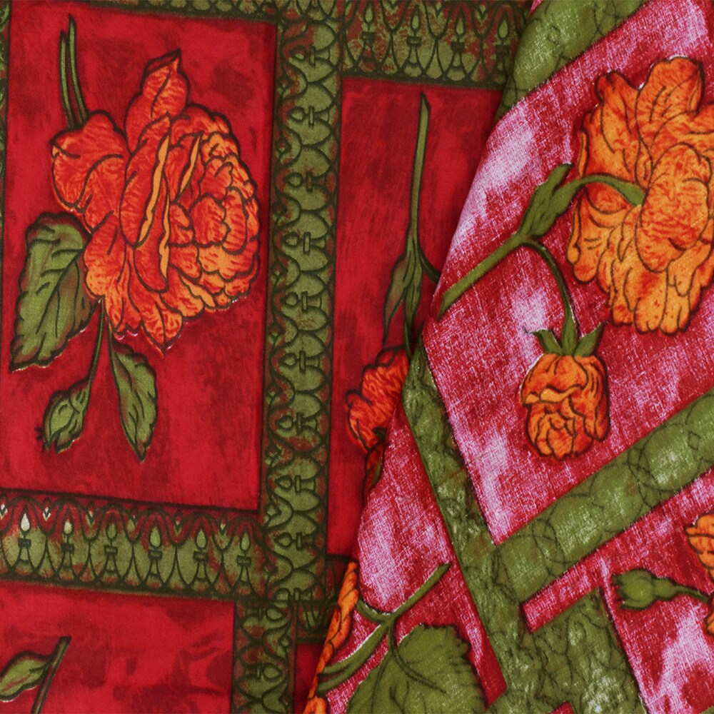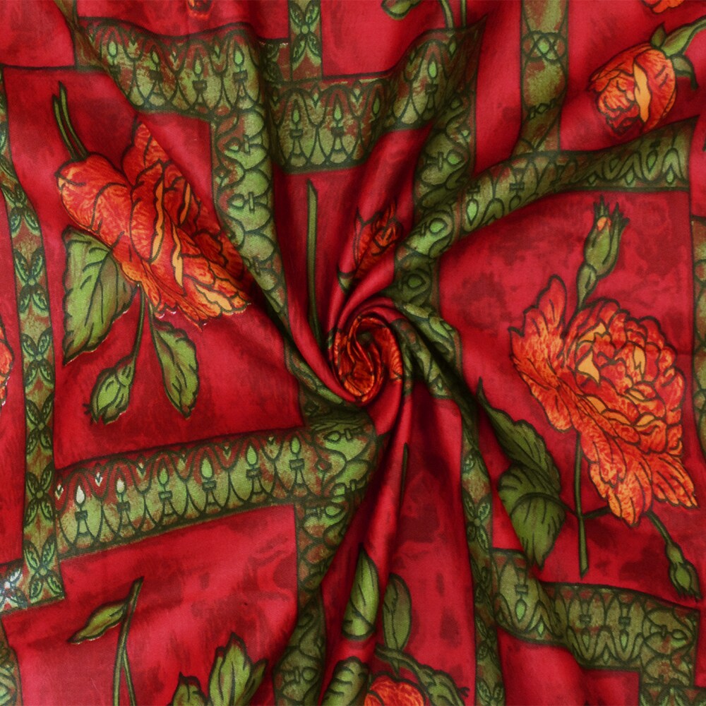 Cherry Red-Green-Multi Floral Frame Printed Cotton Sateen Fabric By the Yard