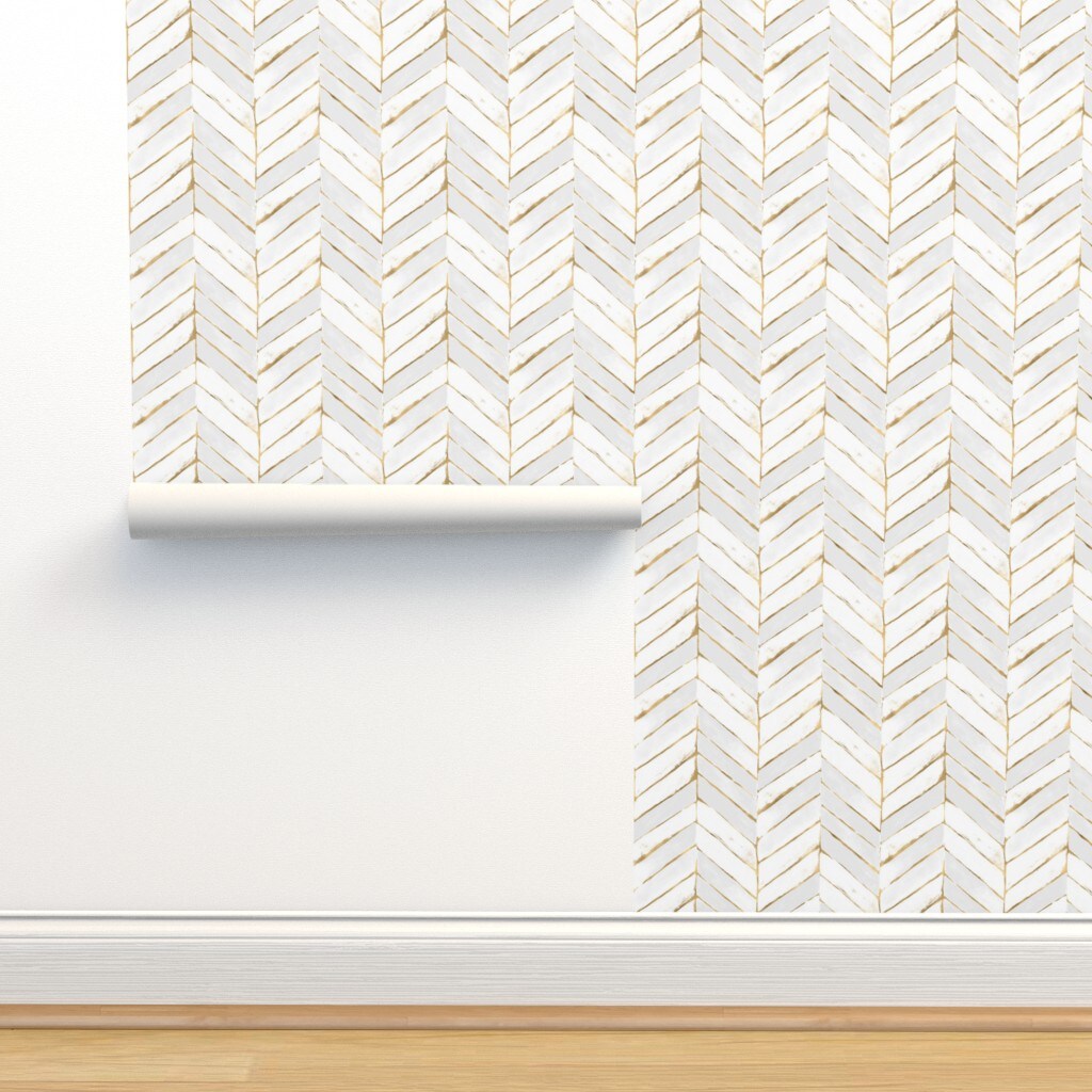 Chevron Painted White Gold Stripe Herringbone Mod Golden Print Look Custom Removable Wallpaper by Spoonflower Peel & Stick Wallpaper 2FT Wide