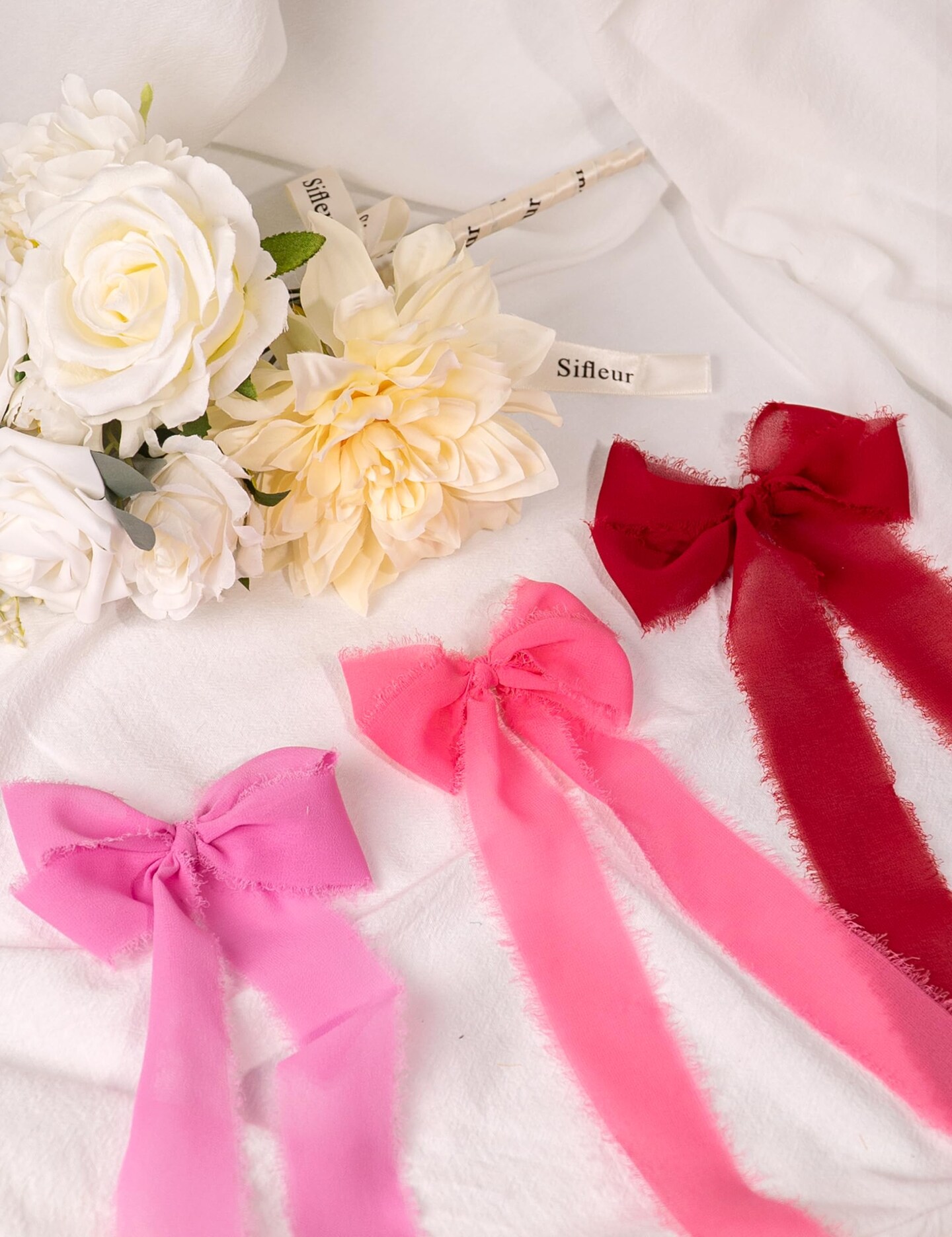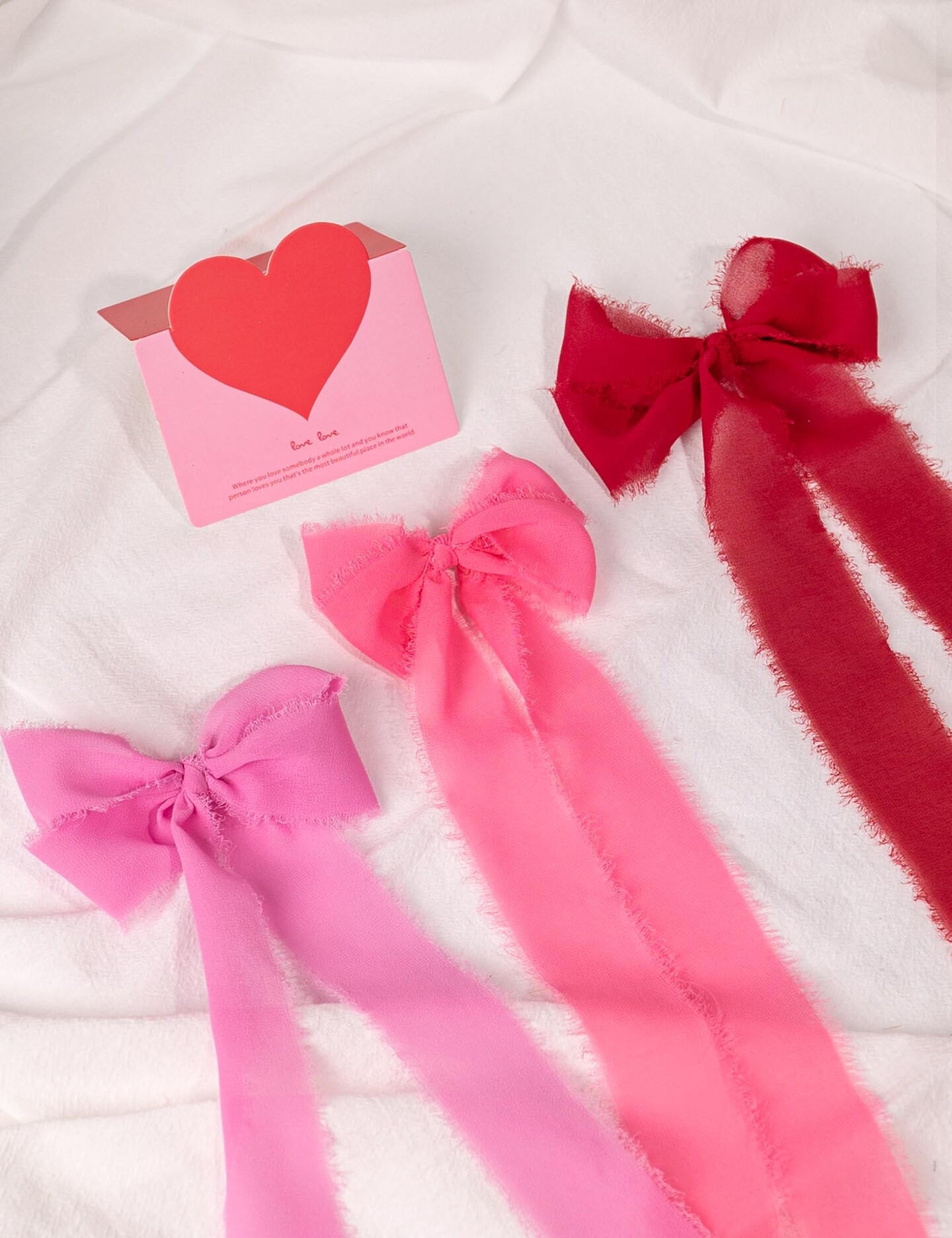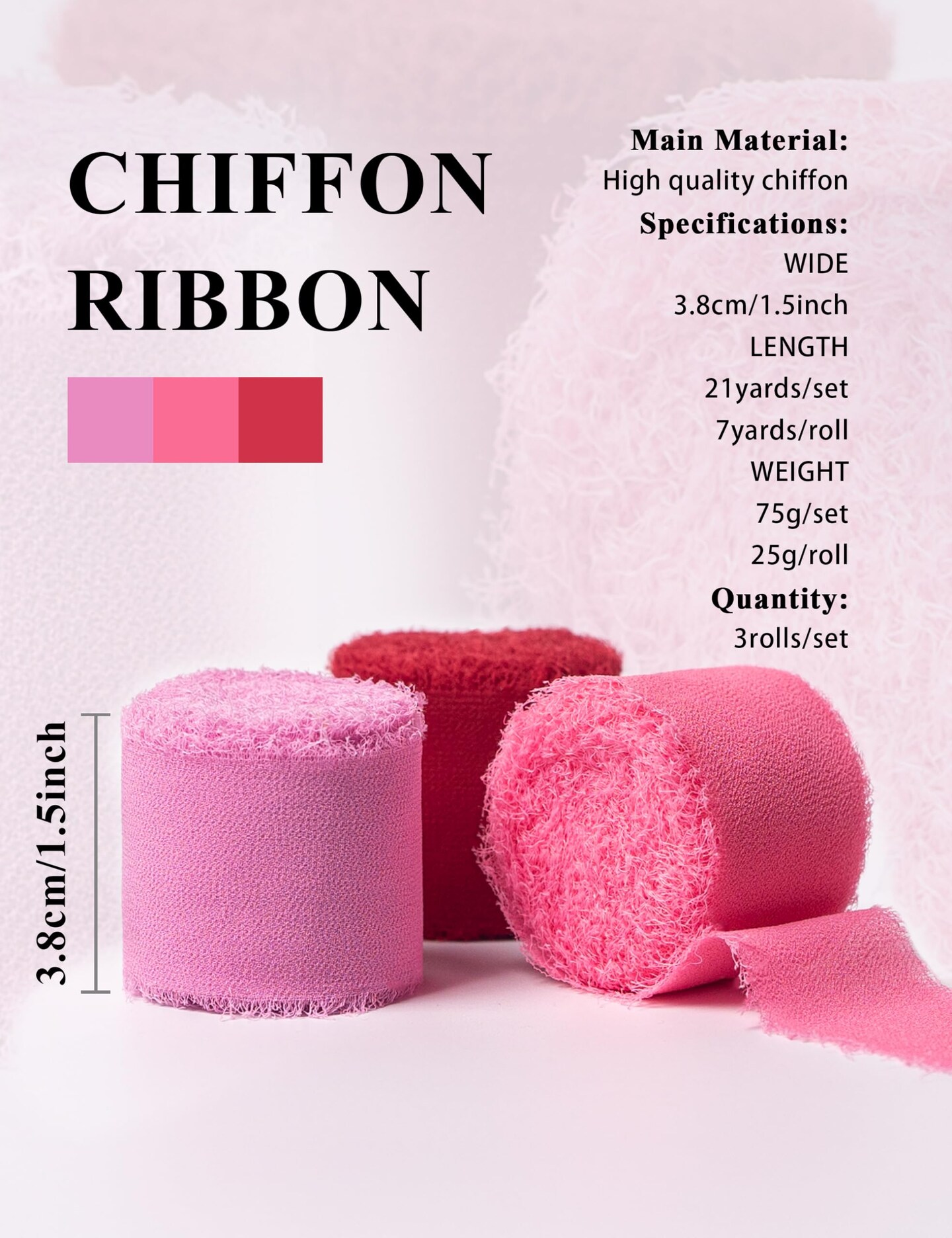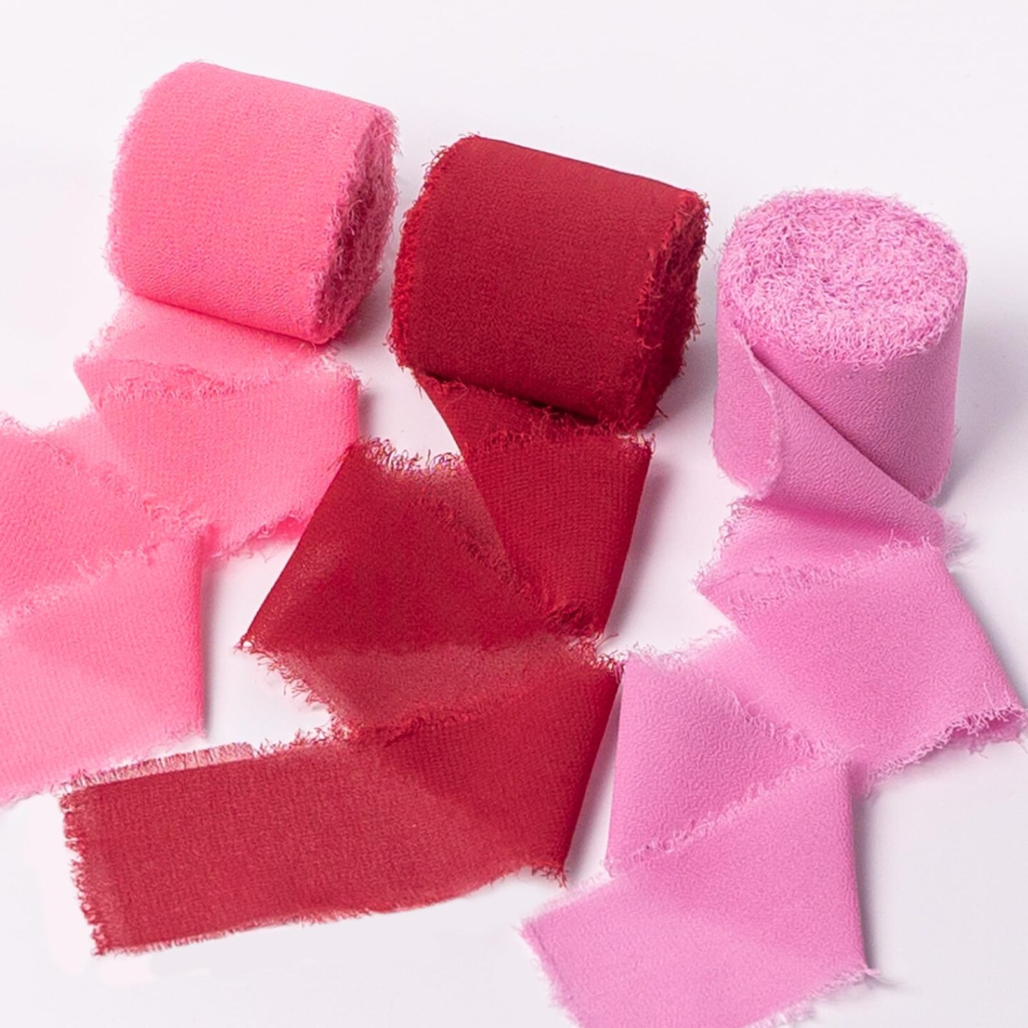 Chiffon Ribbon, Valentine's Day Party Decoration, 1.5''x21Yd Pink Red Frayed Fringe Handmade Silk Ribbons for Rose Floral Gift Wrapping, Wedding, Birthday, Engagement, Bridal Shower, 3 Rolls